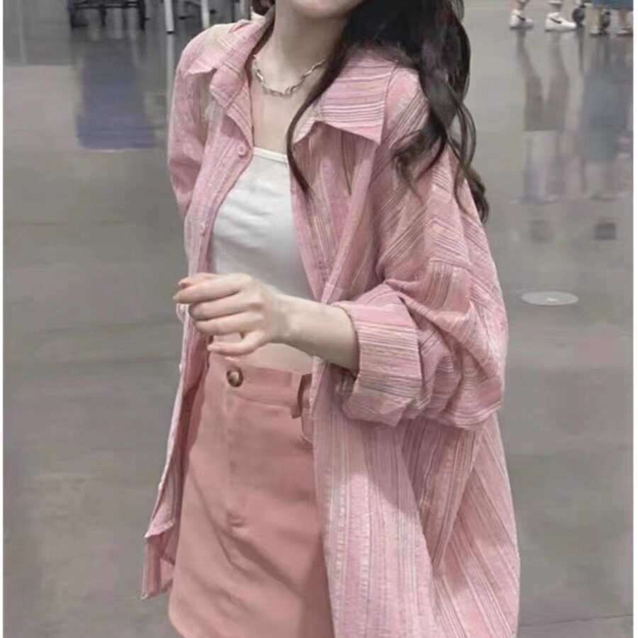2026新款早春装外搭开衫慵懒宽松上衣防晒衬衣粉色条纹衬衫外套女