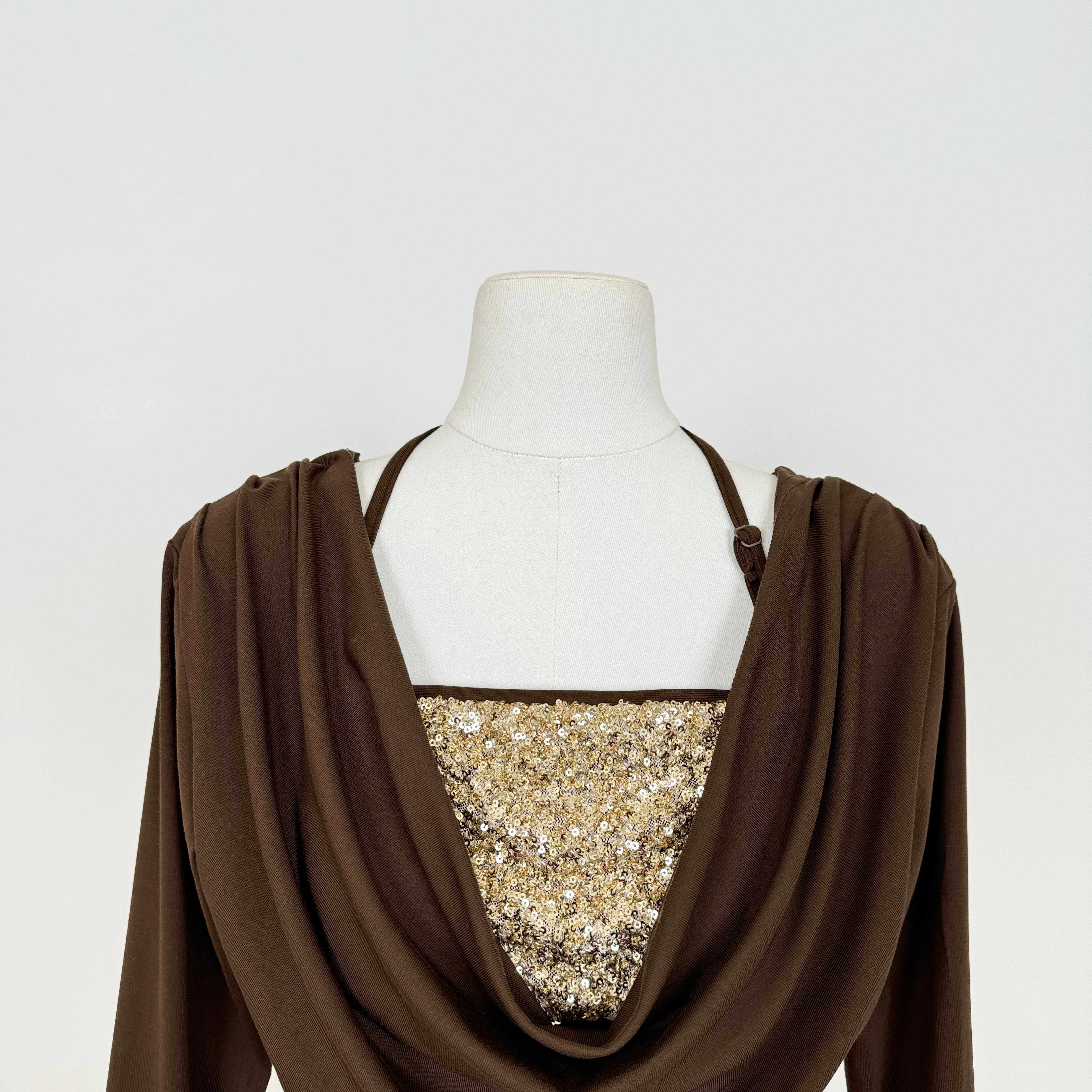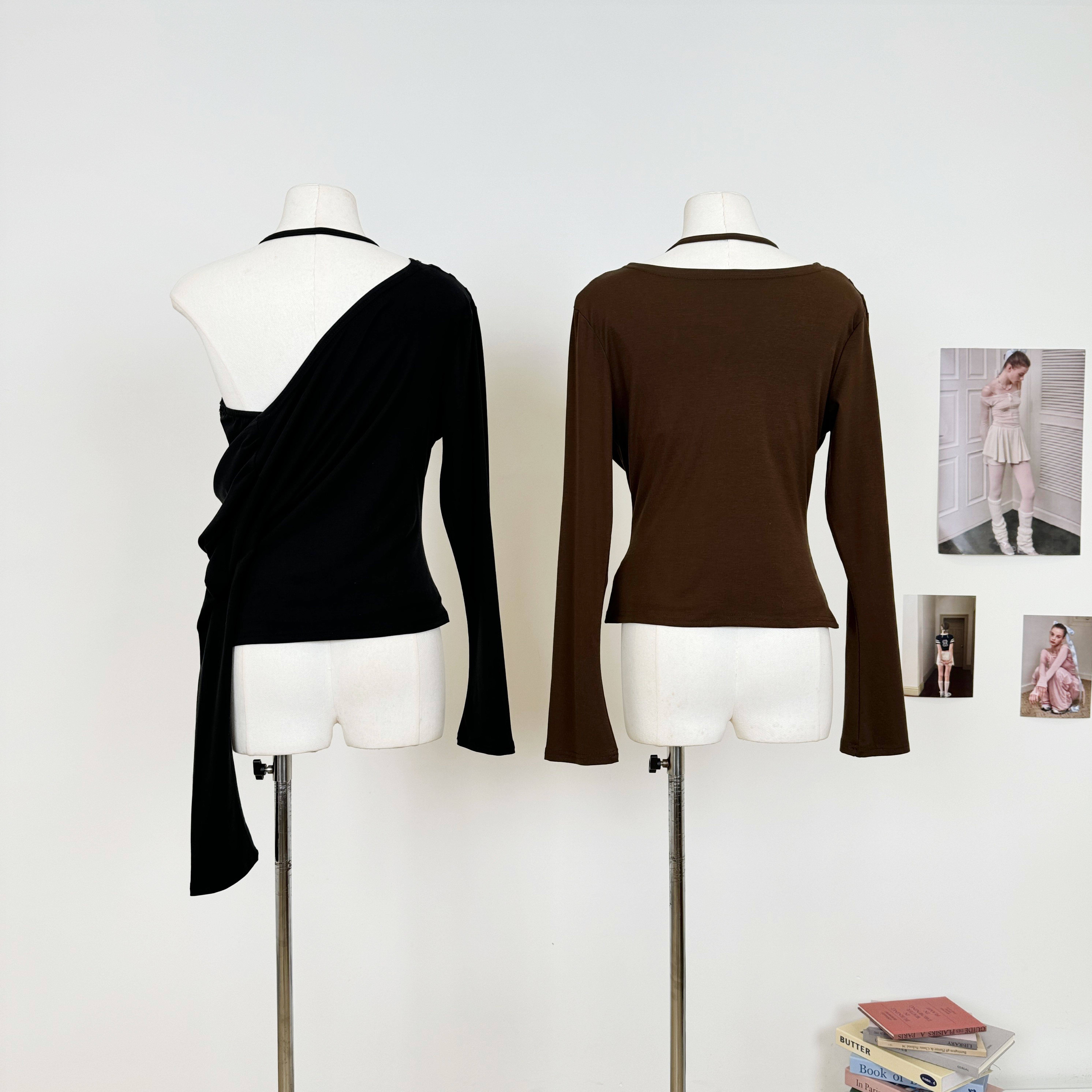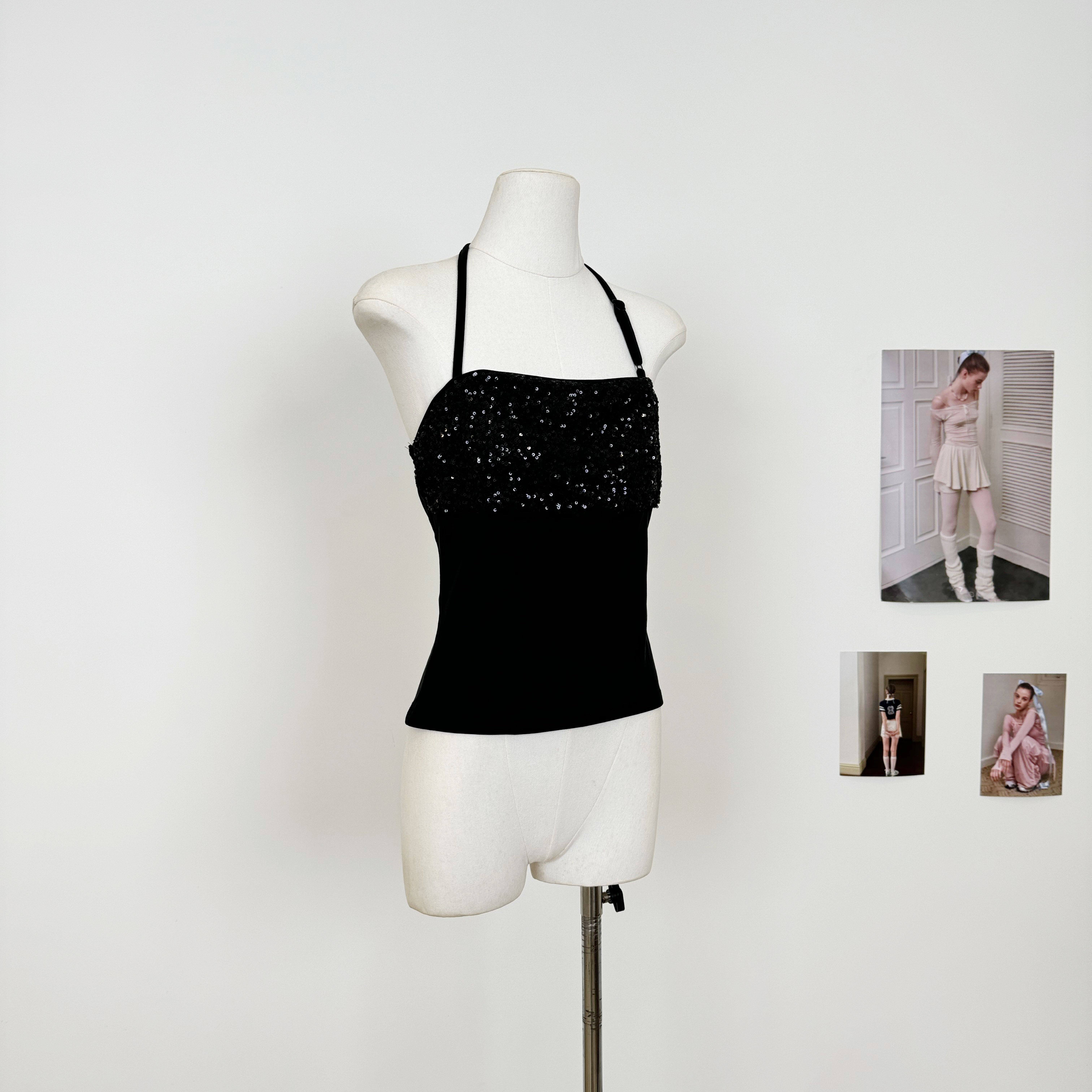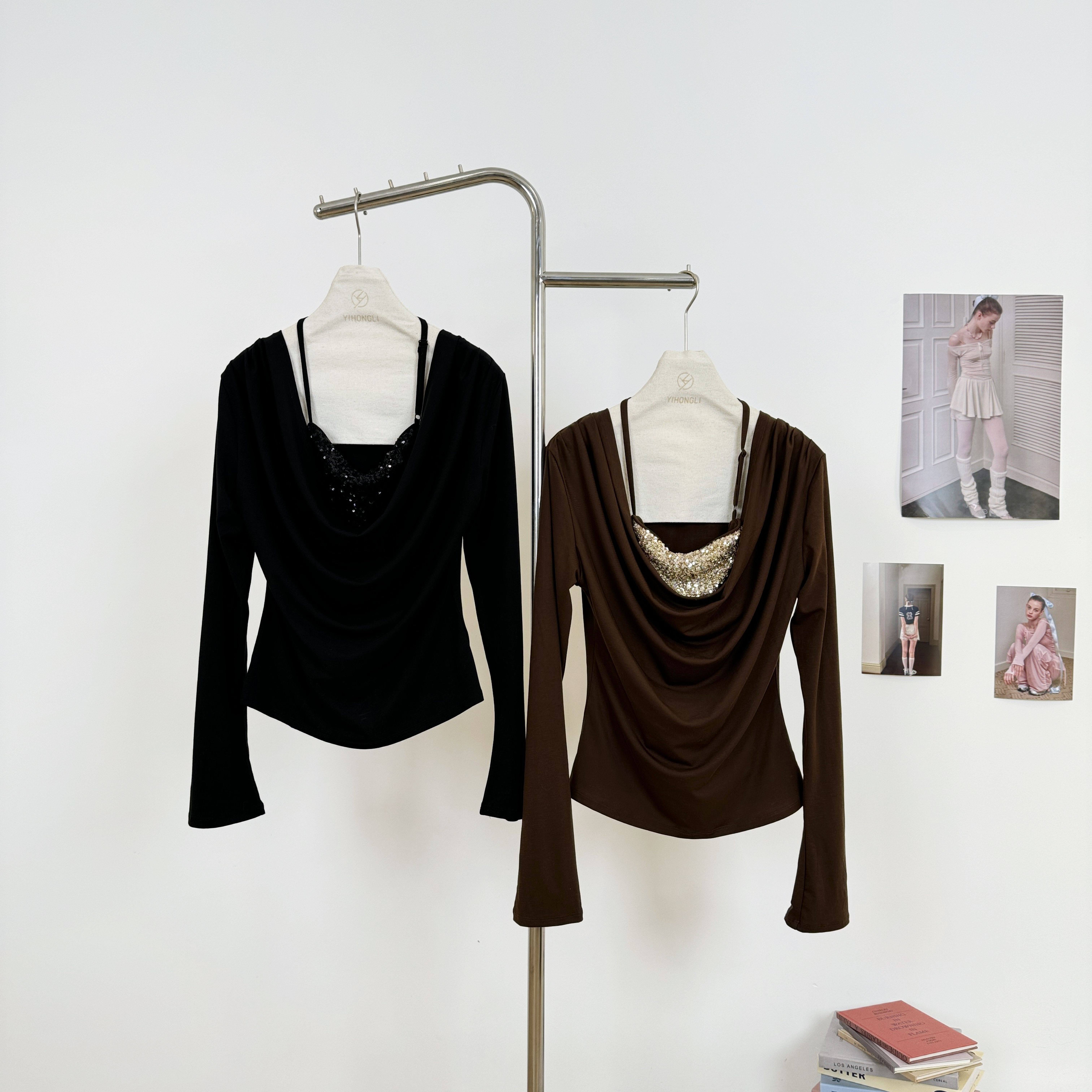 “霓幻”两件套针织亮片挂脖背心荡领长袖打底衫上衣