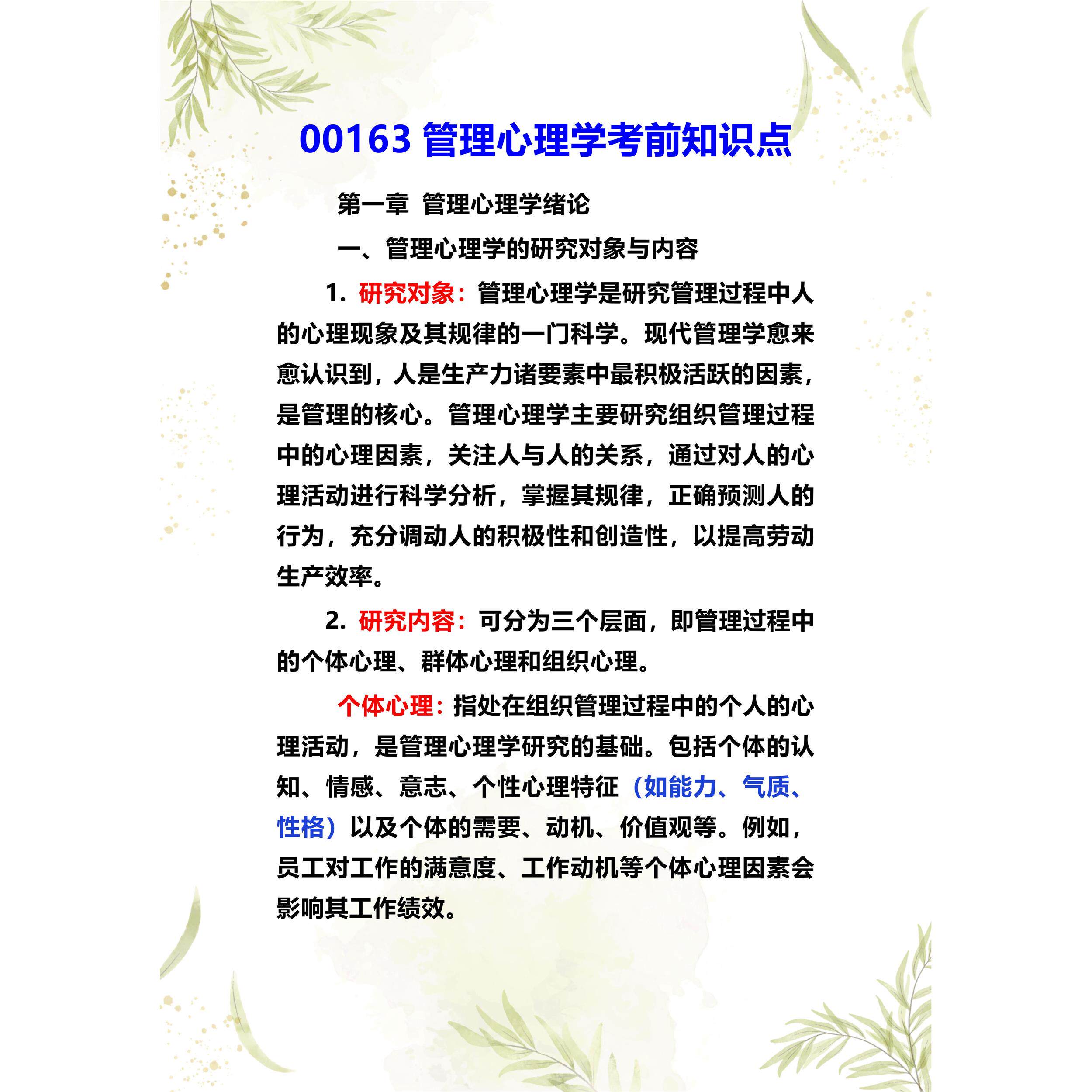 考点重点 00163管理心理学 考纲讲解自考笔记 资料 自考复习过关思维导图 精讲视频网课 考前押题资料