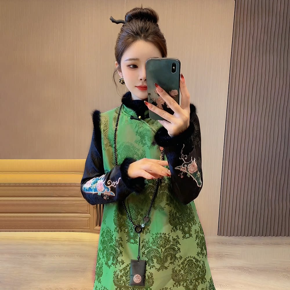 新中式大码套装女胖mm冬加厚马甲裙两件套加绒小衫女200斤连衣裙