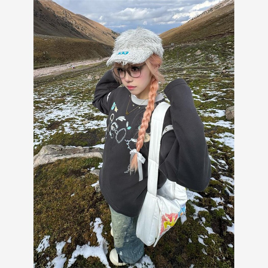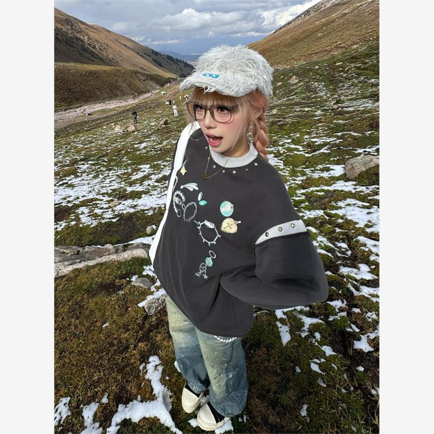 美式覆古卫衣女早春新款珠宝印花解构重磅长袖套头宽松设计感上衣