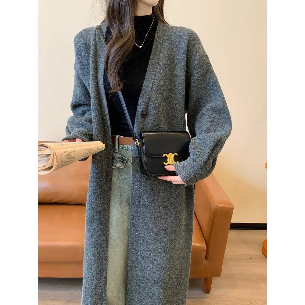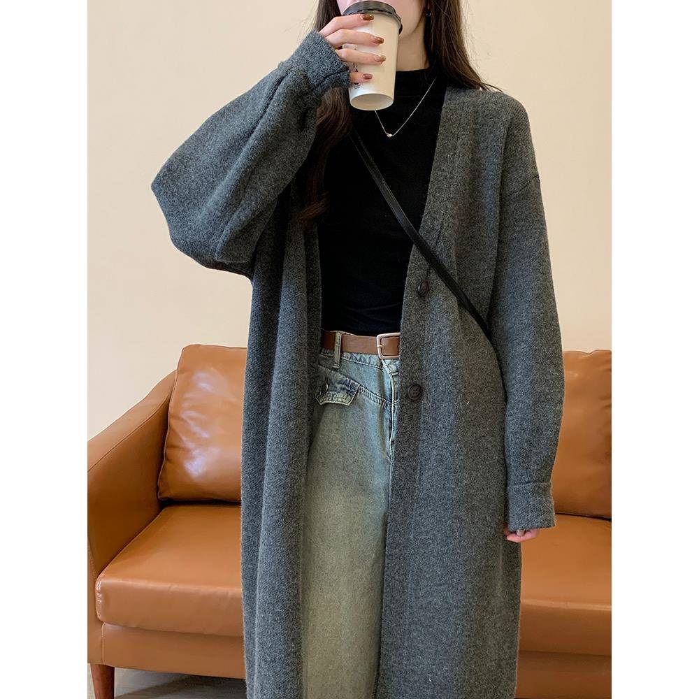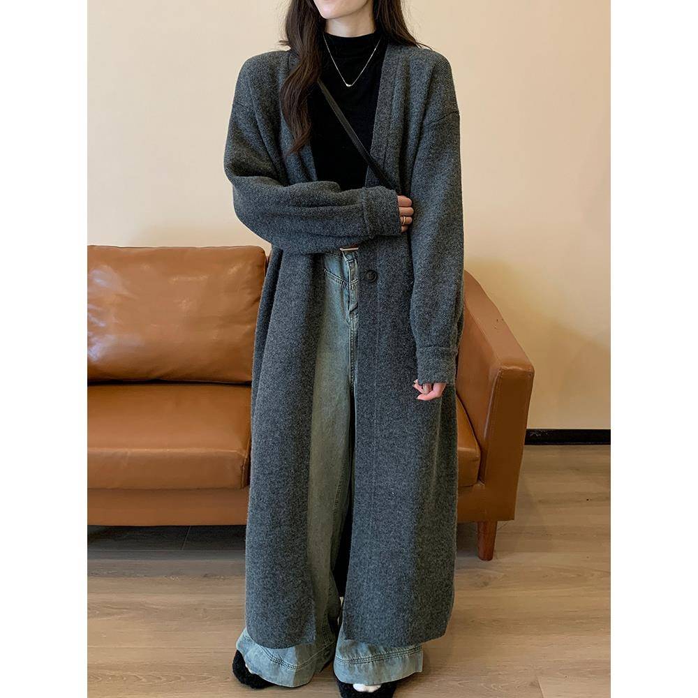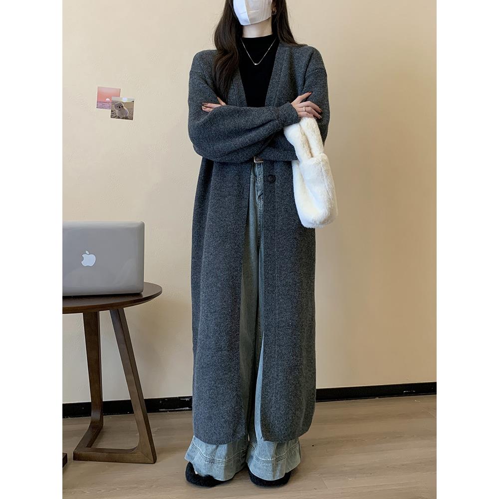 高挑超长毛衣,开襟针织女式懒散宽松软蜡质深灰色长秋冬加厚
