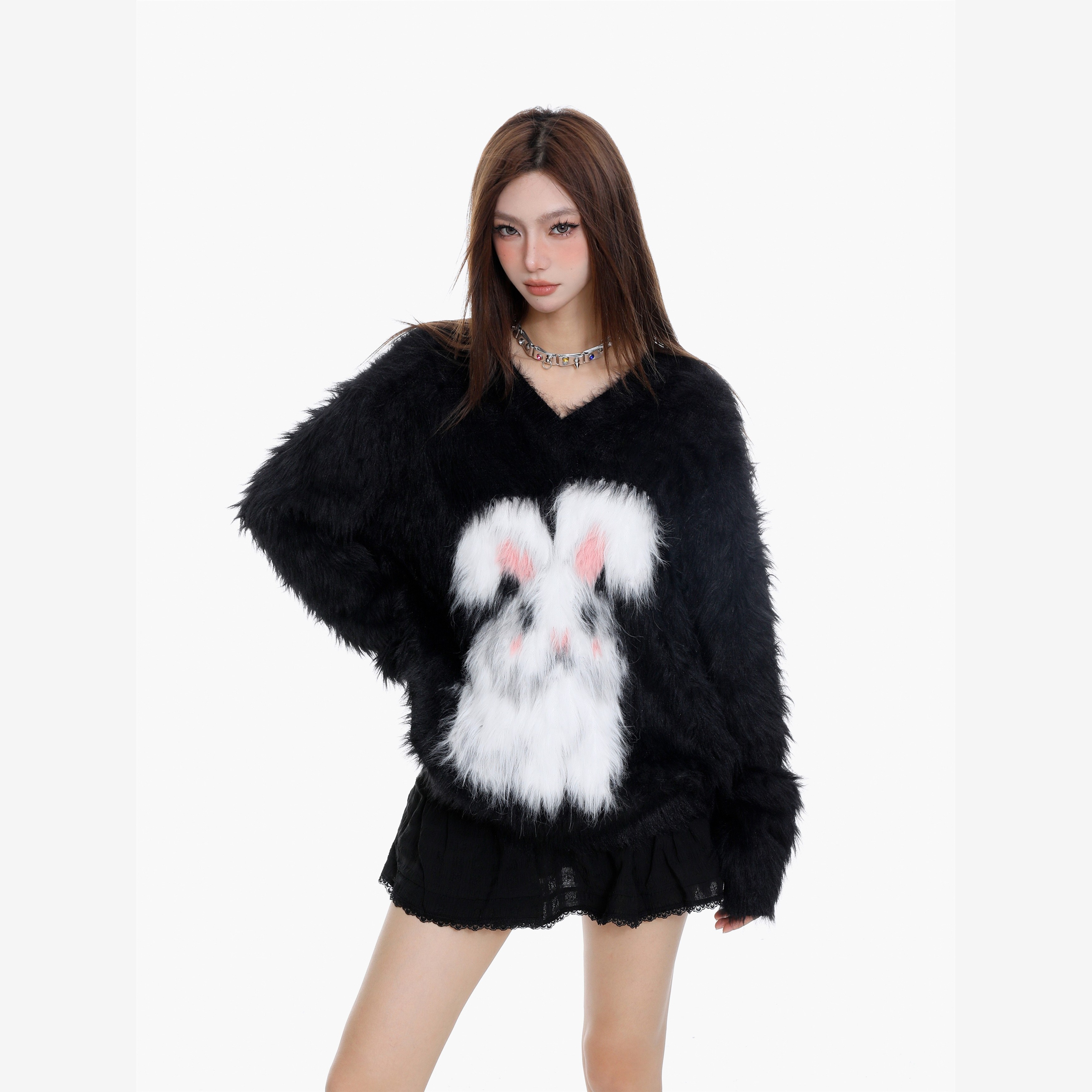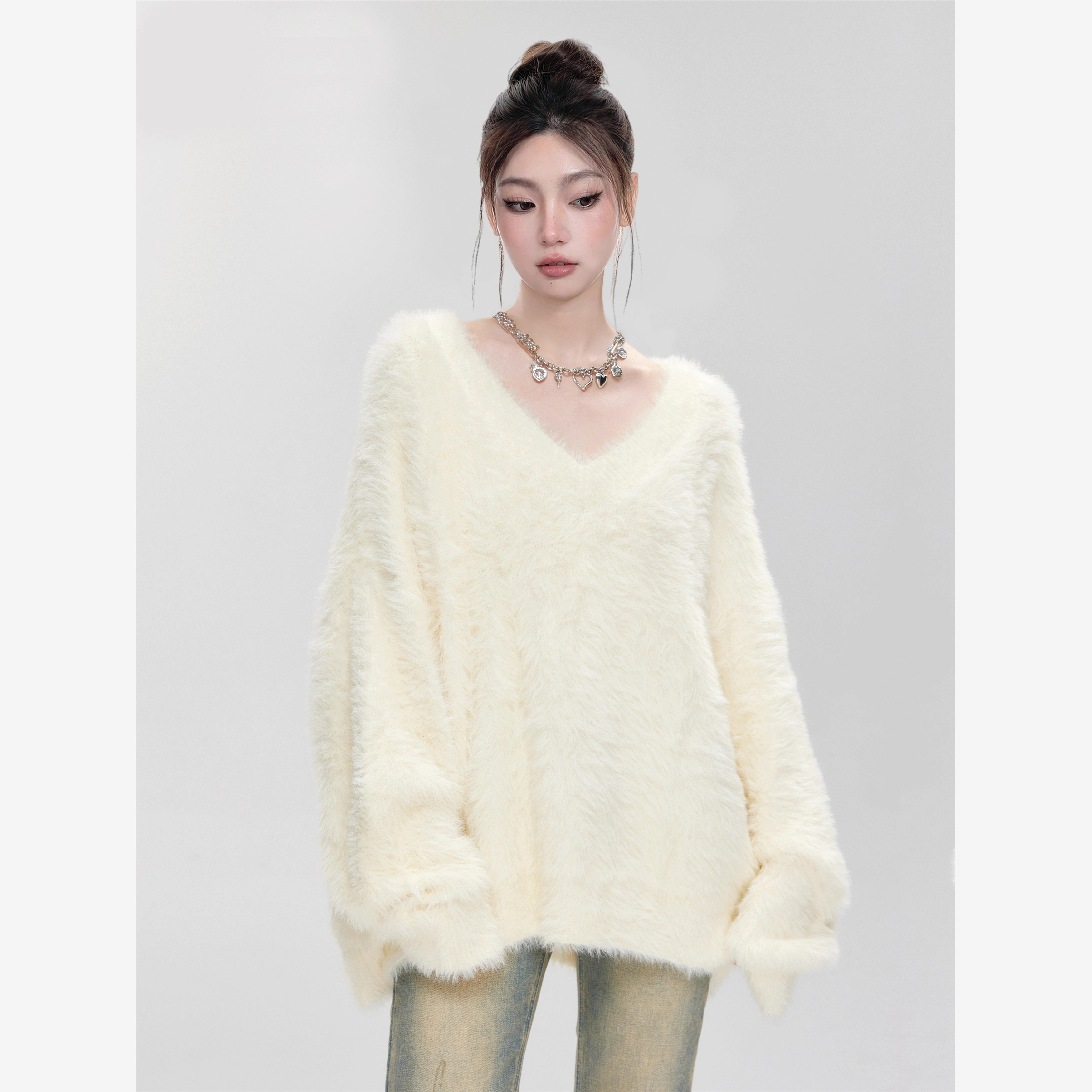 奶fufu白色水貂绒V领套头毛衣女秋冬季内搭软糯慵懒马海毛针织衫
