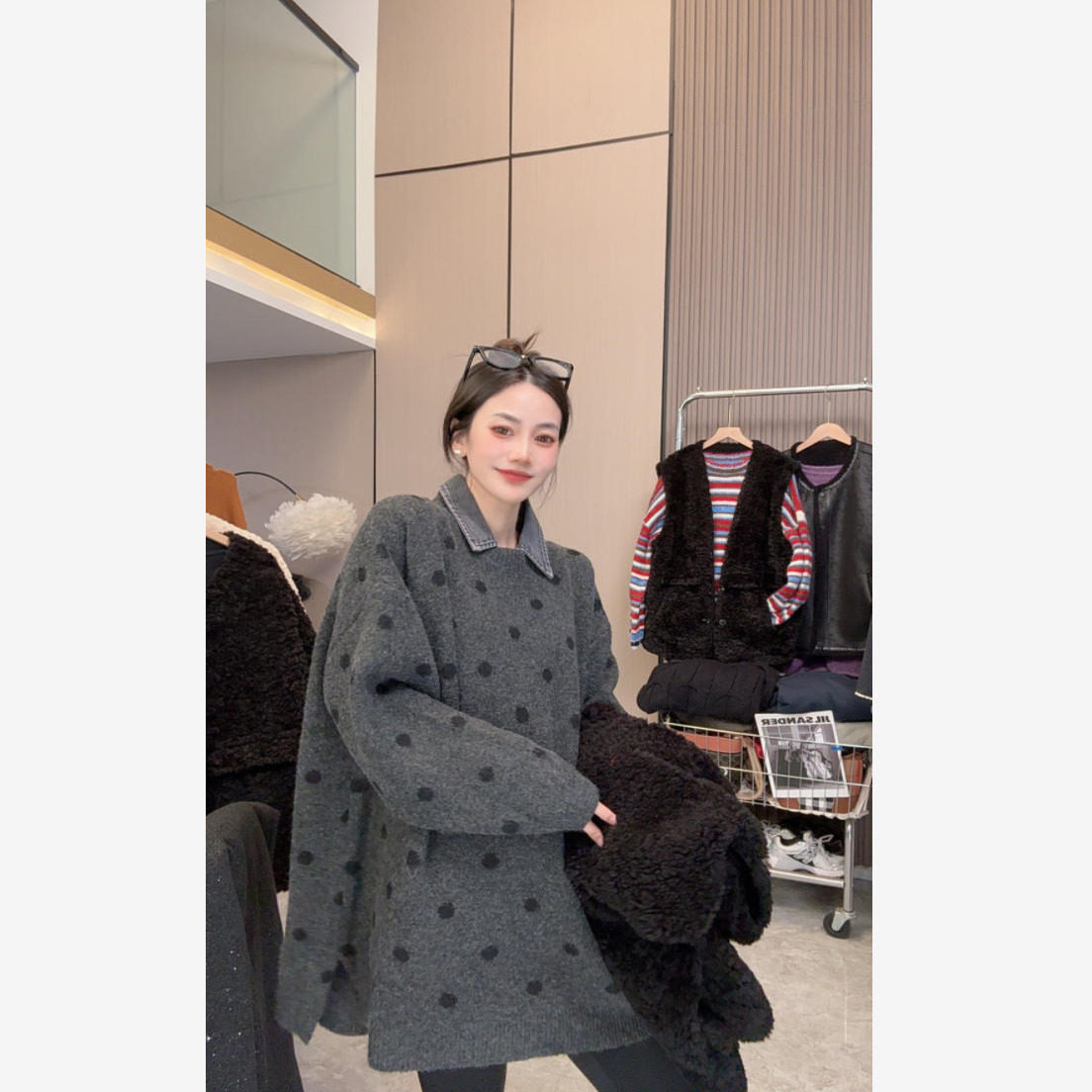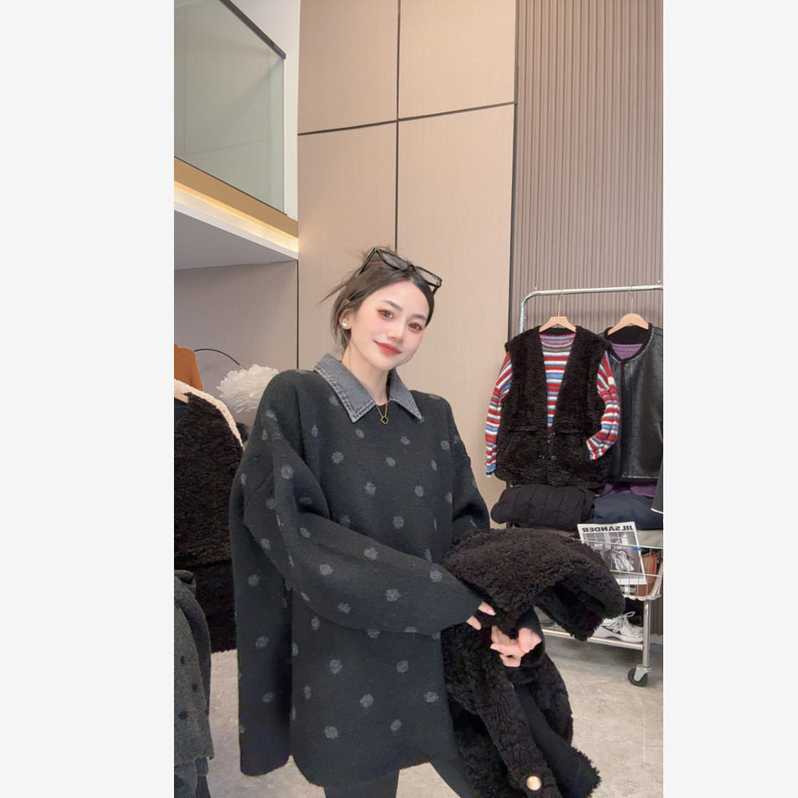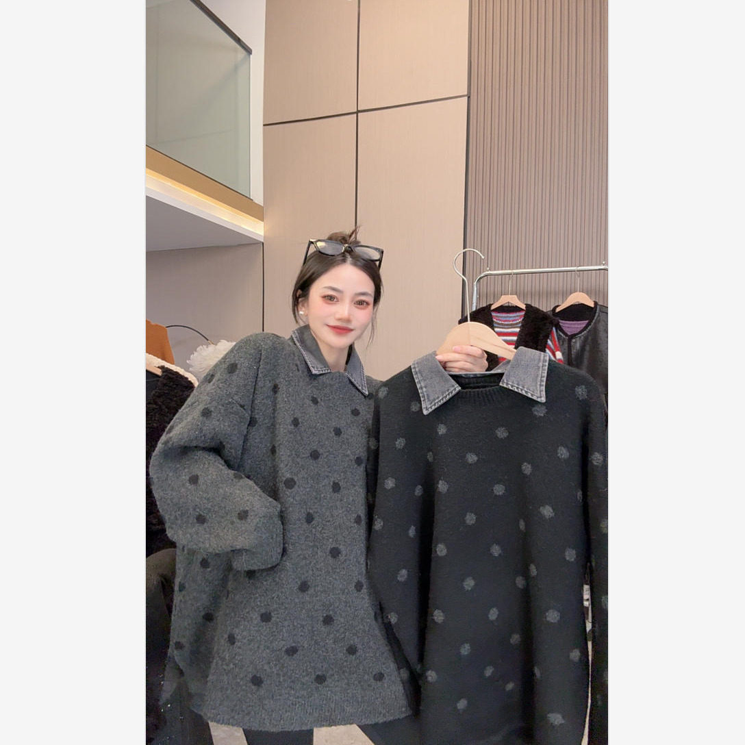 【自带艺术感】慵懒随性~牛仔领口复古腔调波点毛衣长袖上衣