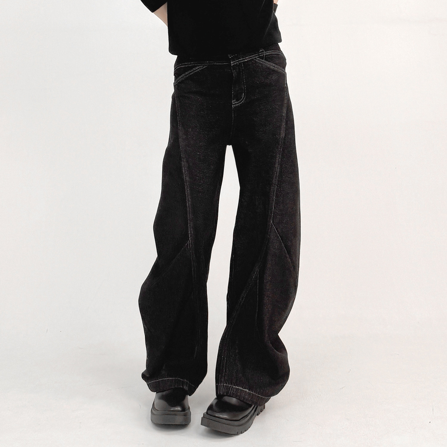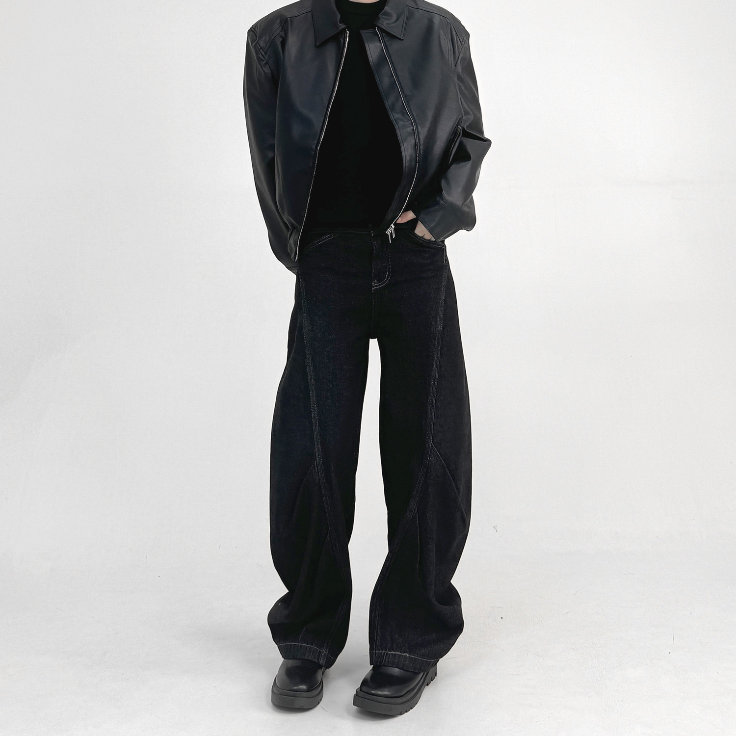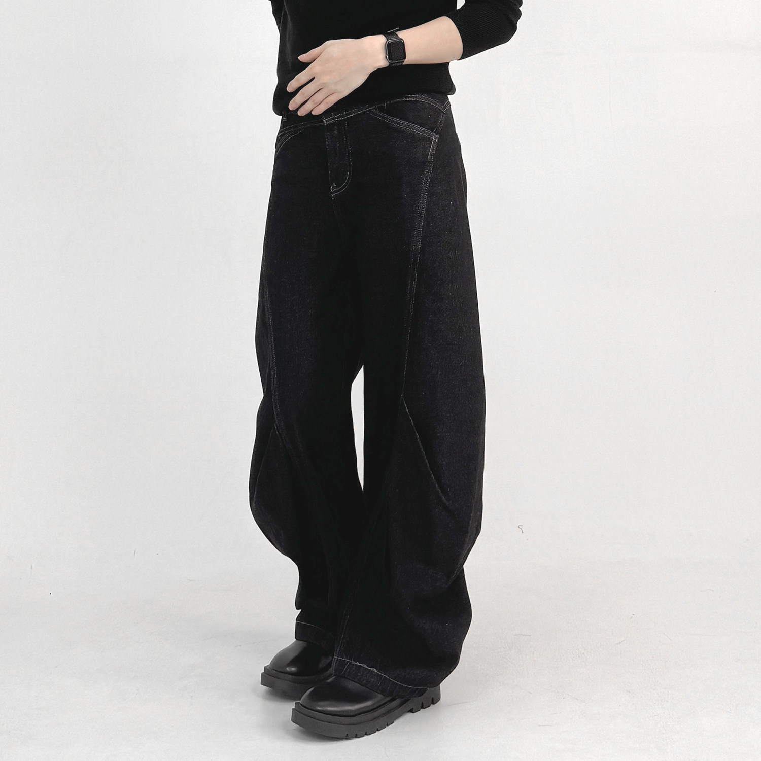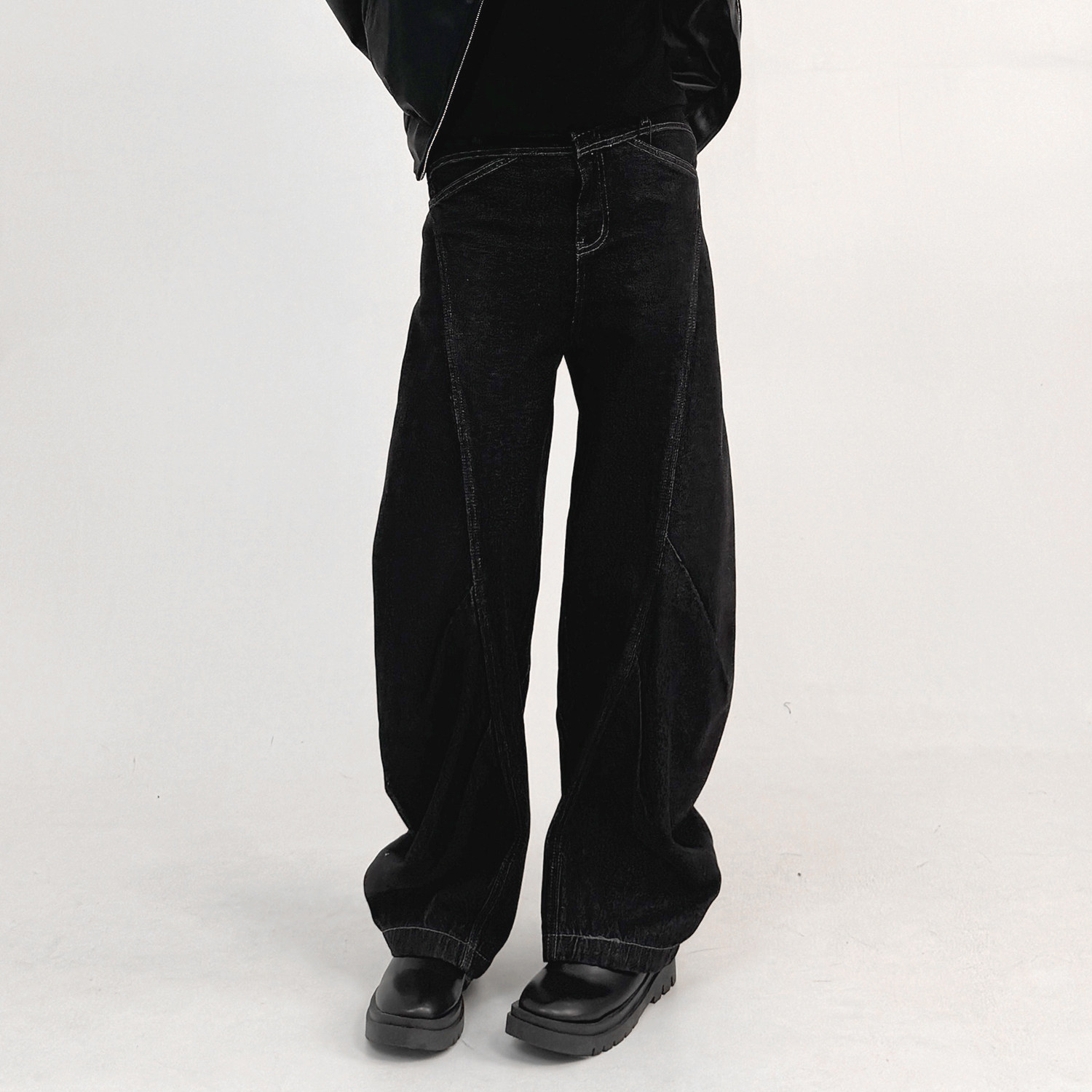 mountain tree立体廓形压褶做旧水洗弯刀牛仔裤男小众复古阔腿裤