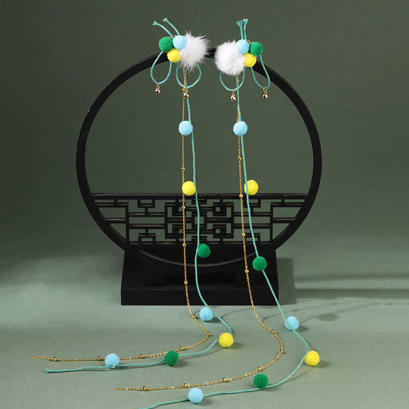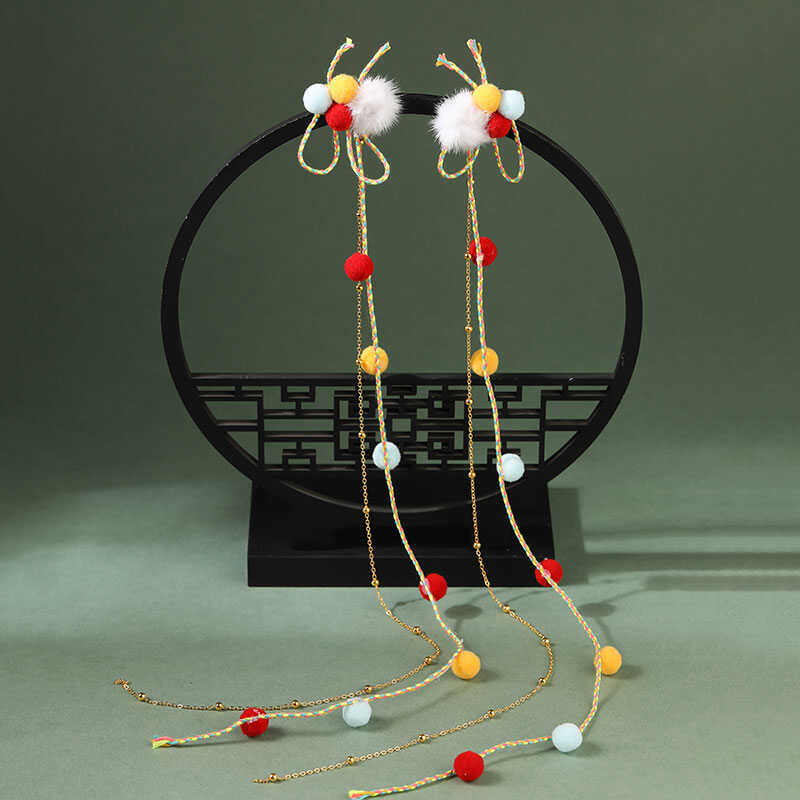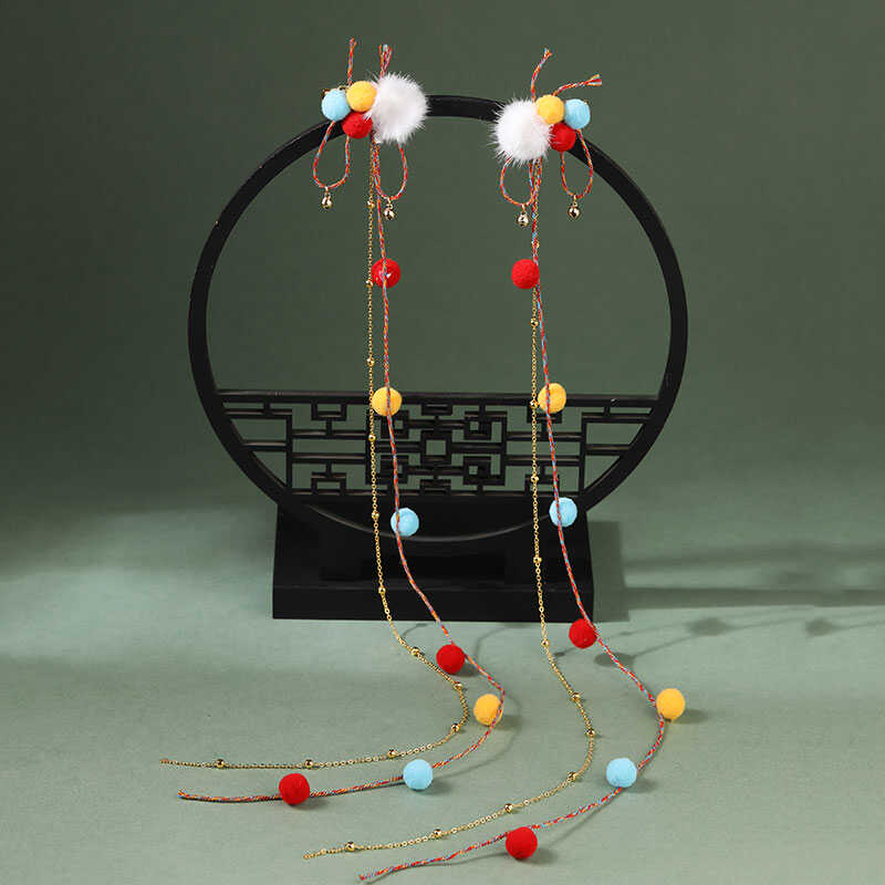 古风发夹长流苏步摇夹子彩色毛球发饰可爱儿童头饰边夹民族风配饰