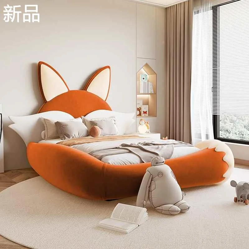 儿童床女孩小狐狸轻奢实木绒布单人床少女心公主床女童软包护新品