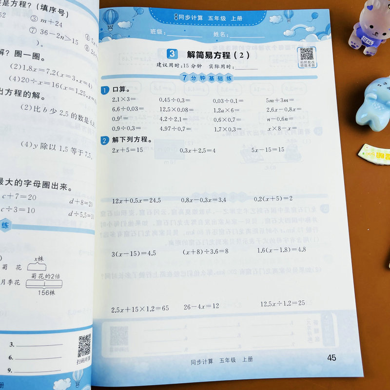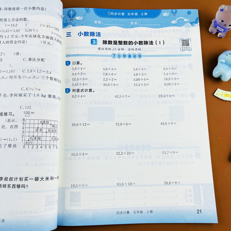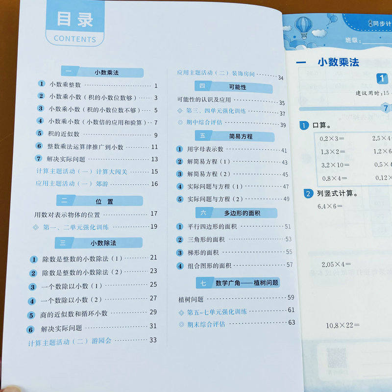五年级上册小学数学同步计算人教版课本同步练习册口算竖式应用题全题型小数乘法小数除法简易方程解方程多边形的面积可能性位置