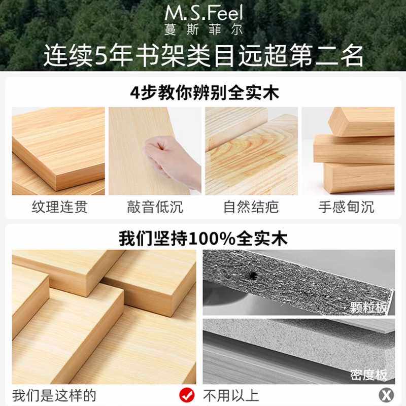 松木实木书架一体靠墙落地置物架儿童书柜学生家用储物柜收纳