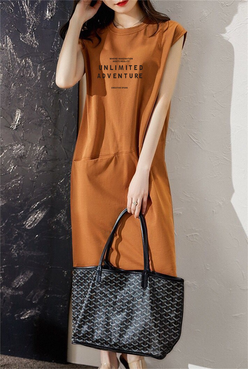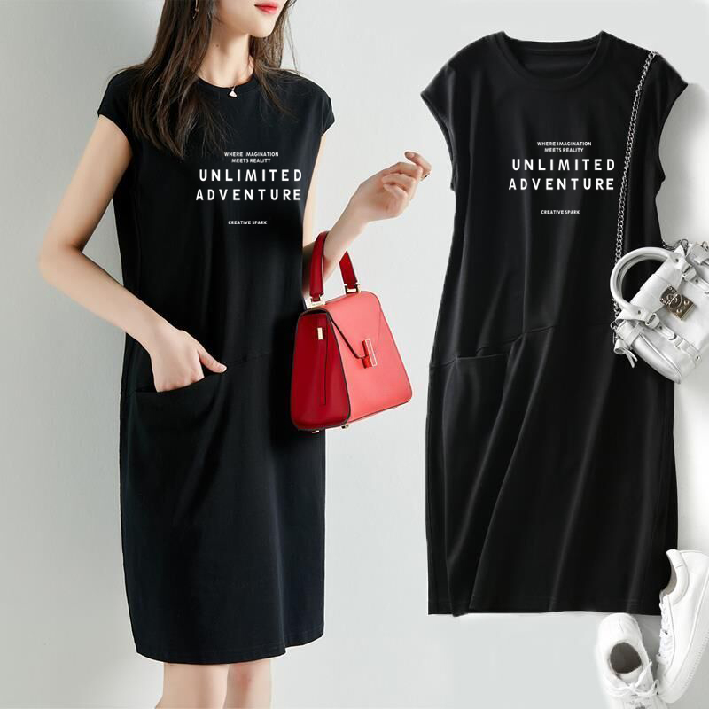 夏季新款短袖女装流行宽松显瘦字母无袖T恤连衣裙中长口袋仙女裙