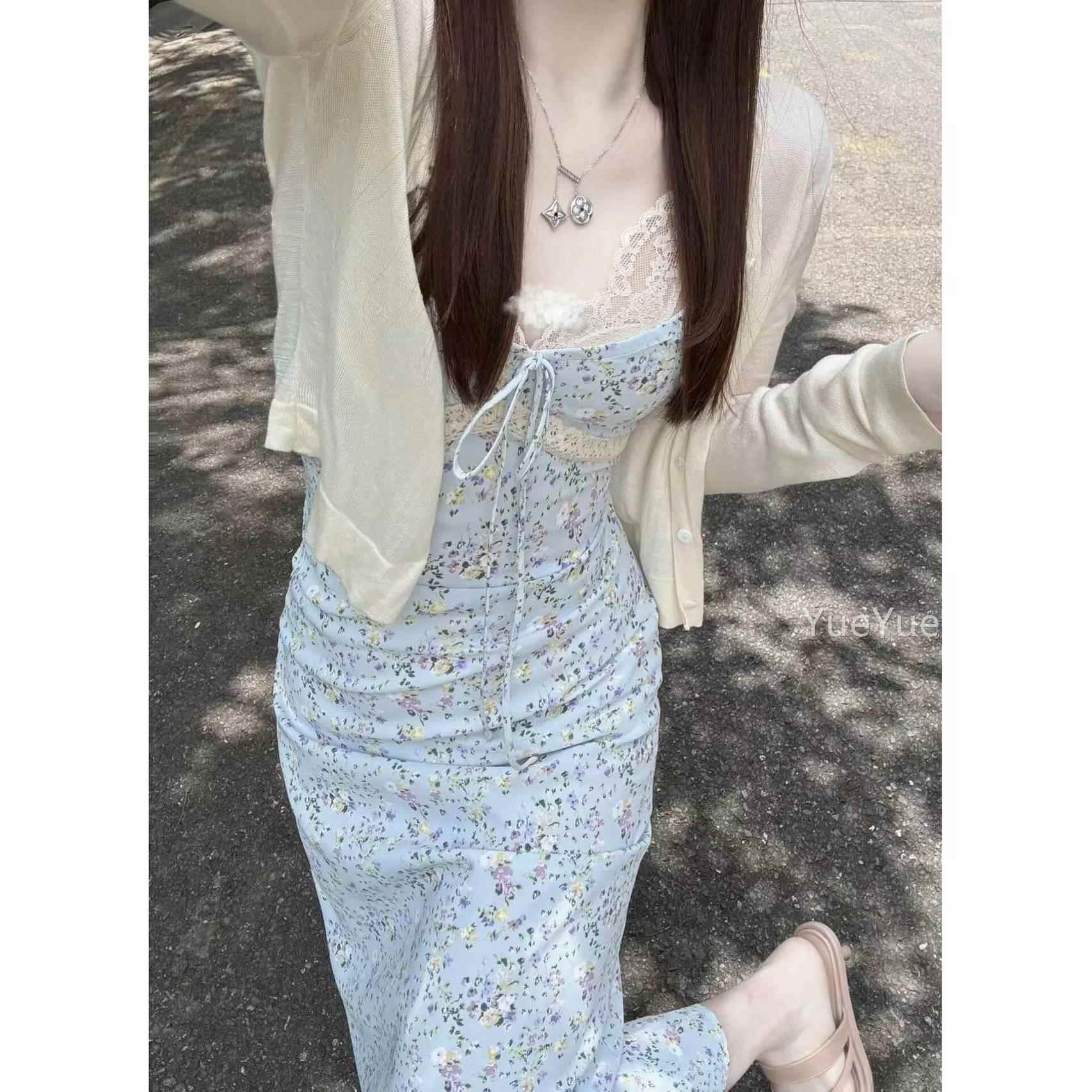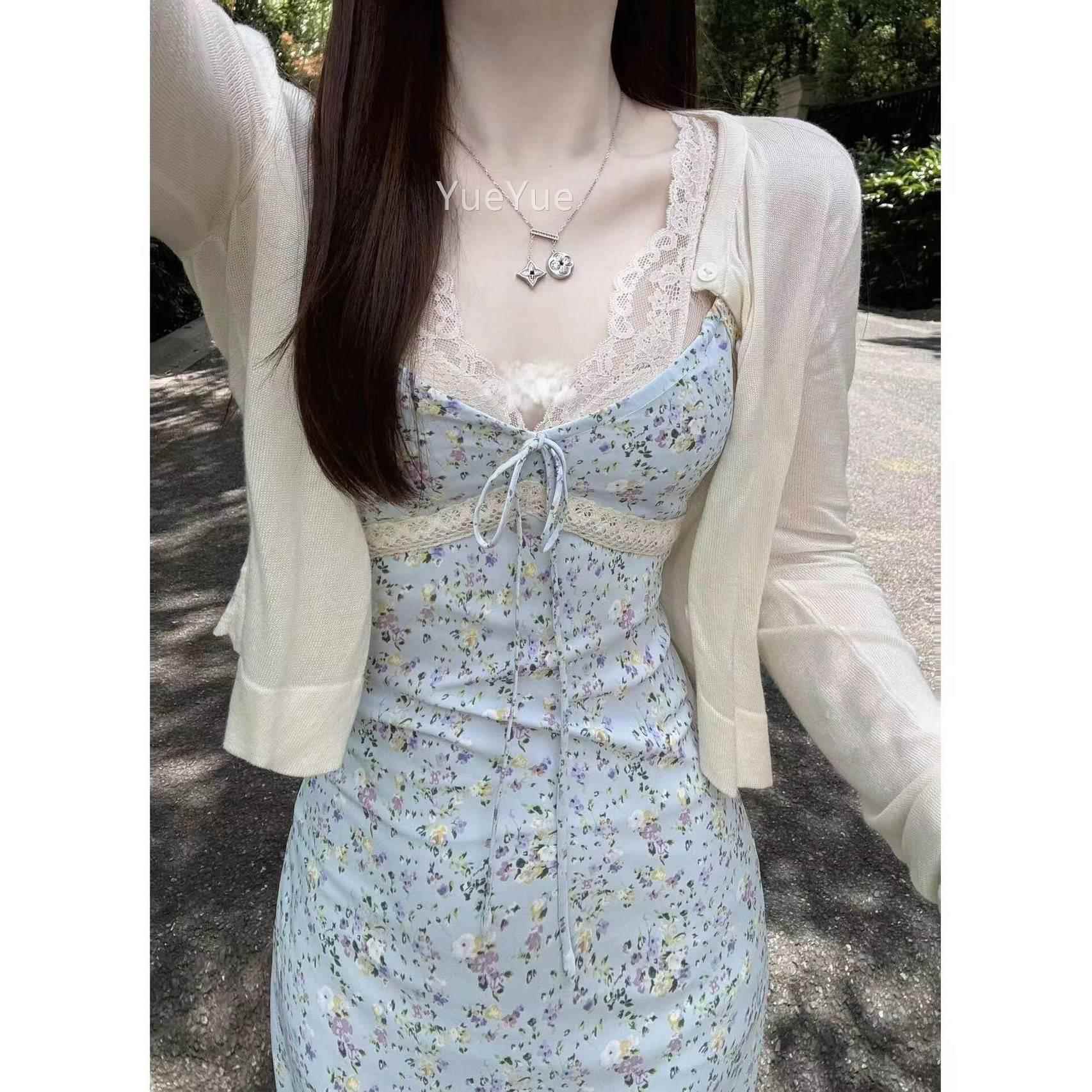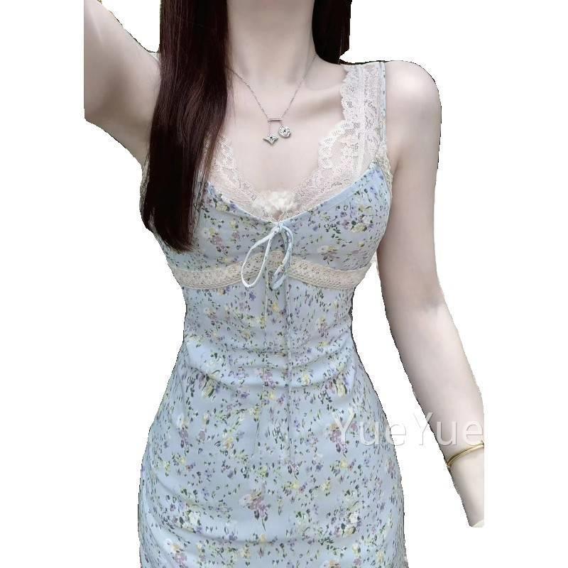 法式优雅气质碎花吊带连夏衣裙女202丝4季新款蕾拼接收801Q腰气质