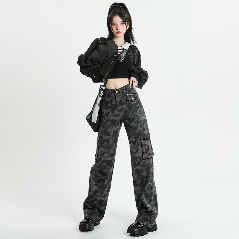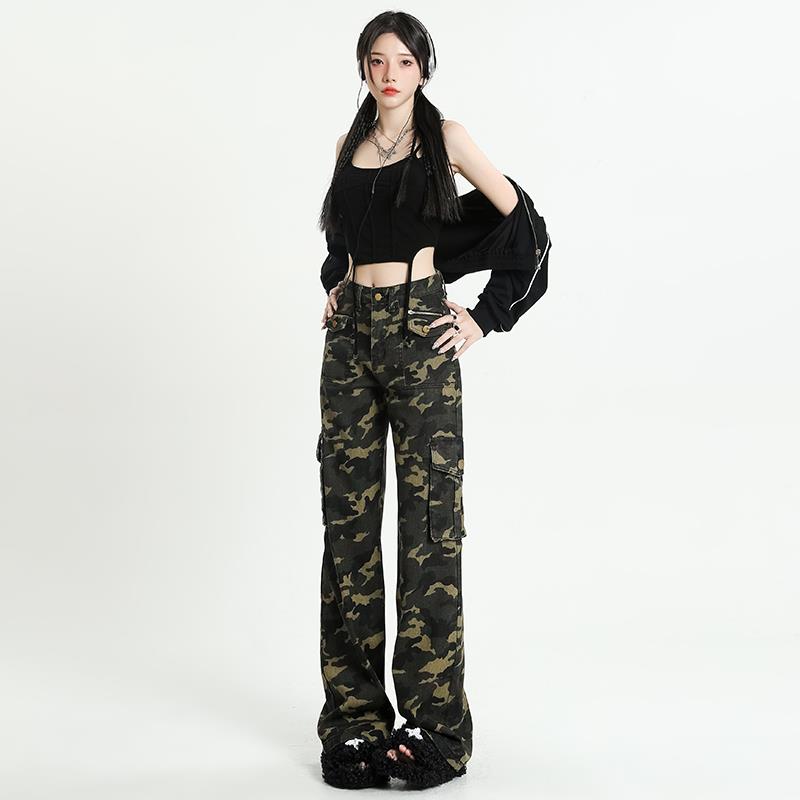 迷彩工装牛仔裤女美式2025新款高腰阔腿宽松显瘦直筒拖地裤子夏季