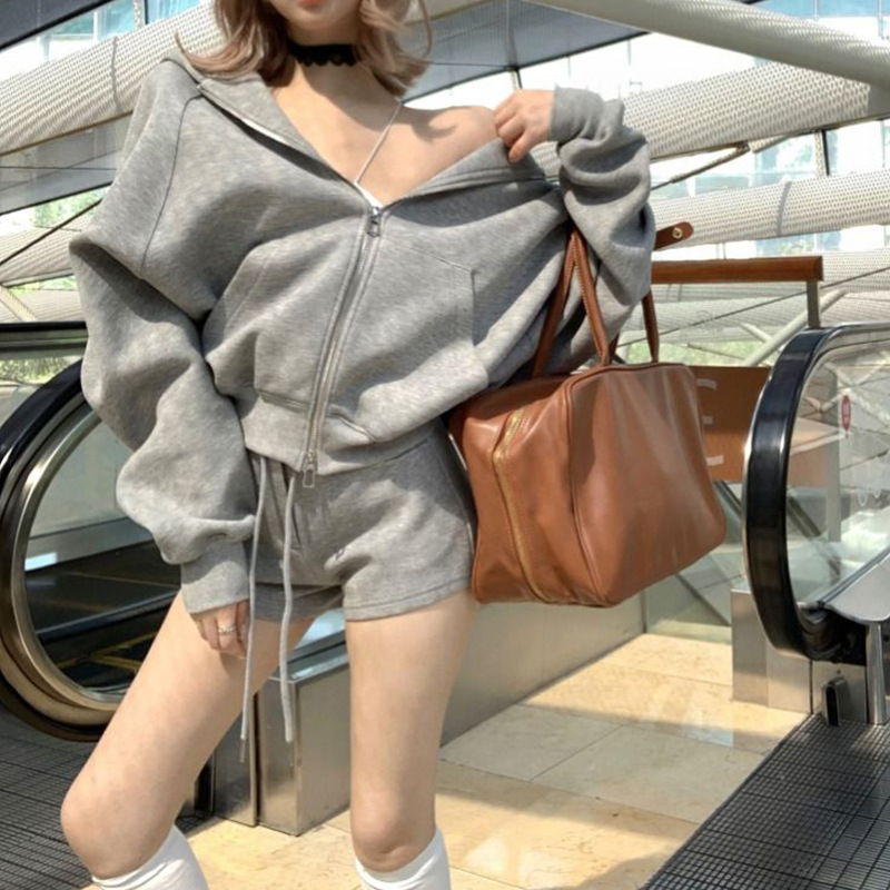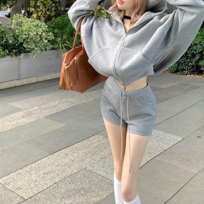 休闲套装灰色连帽卫衣外套女装2025年春秋高腰直筒裤短款两件套