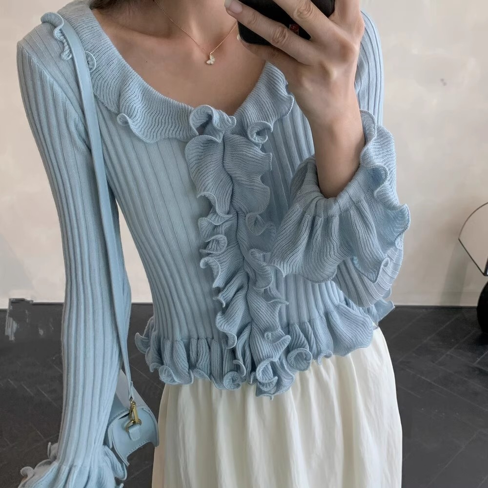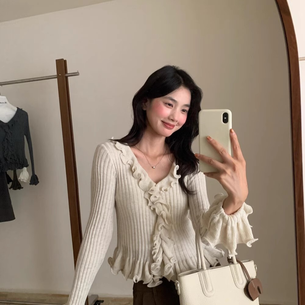 韩版甜美纯欲木耳花边修身针织衫2025秋季新款上衣收腰V领毛衣