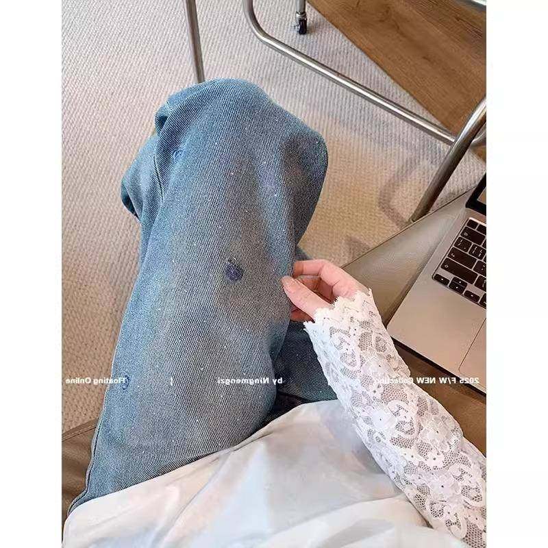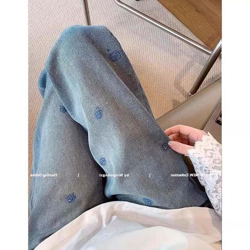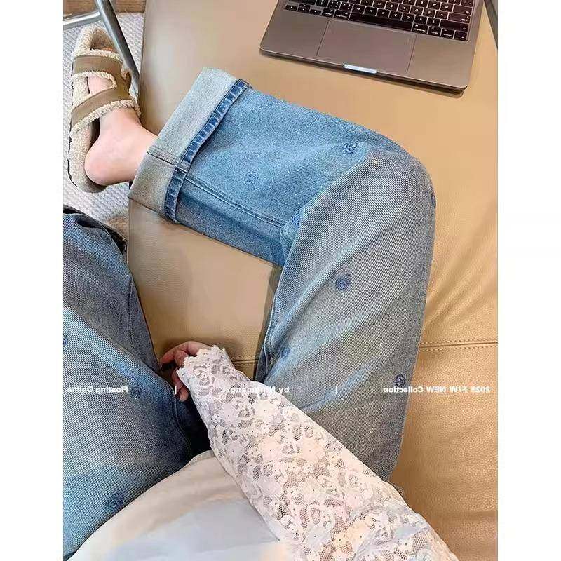 复古刺绣烫钻牛仔裤女春季高腰显瘦窄版直筒裤垂感高级感阔腿裤子