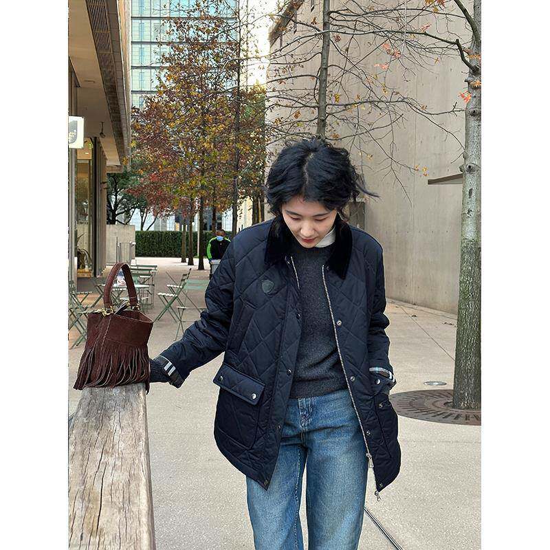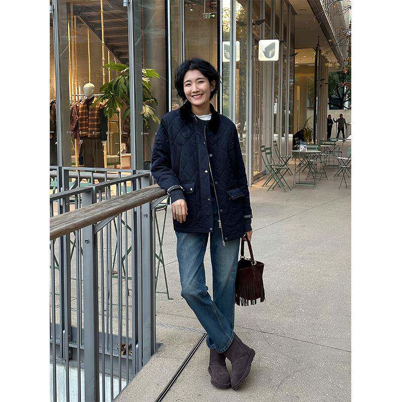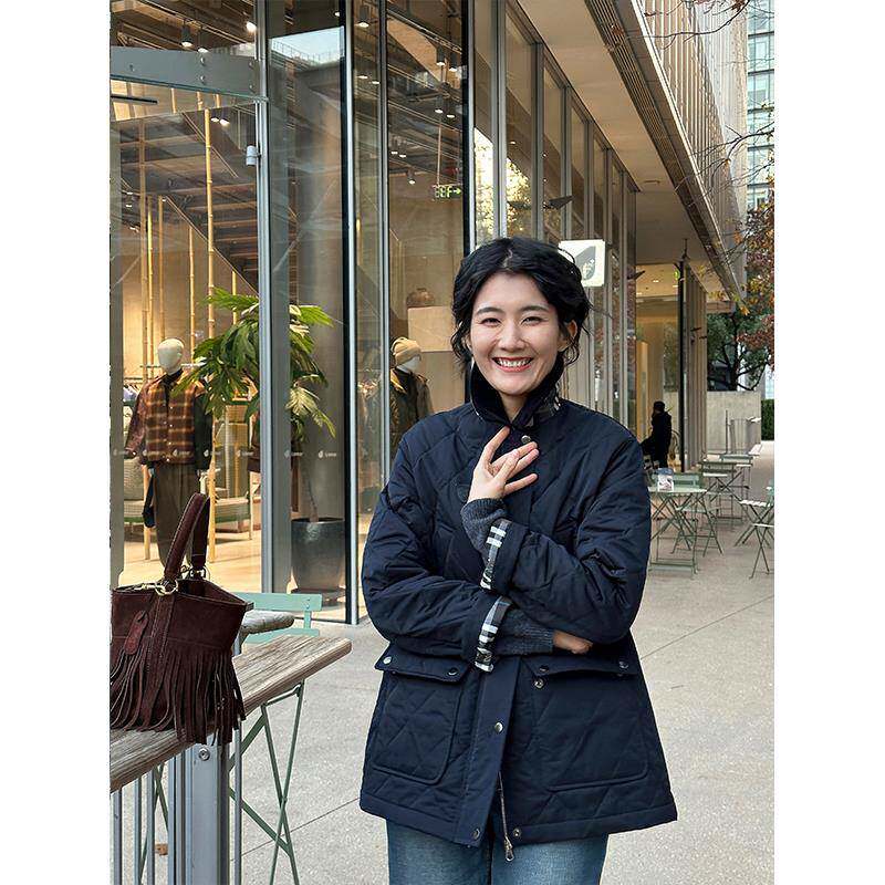 周浪清小个子藏青色翻领菱格棉服女2025新款秋冬中长款巴恩风外套