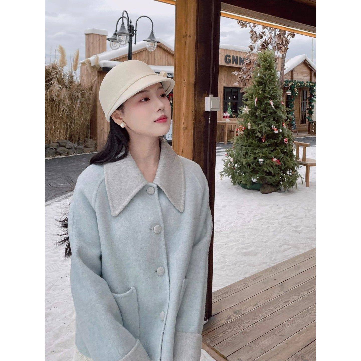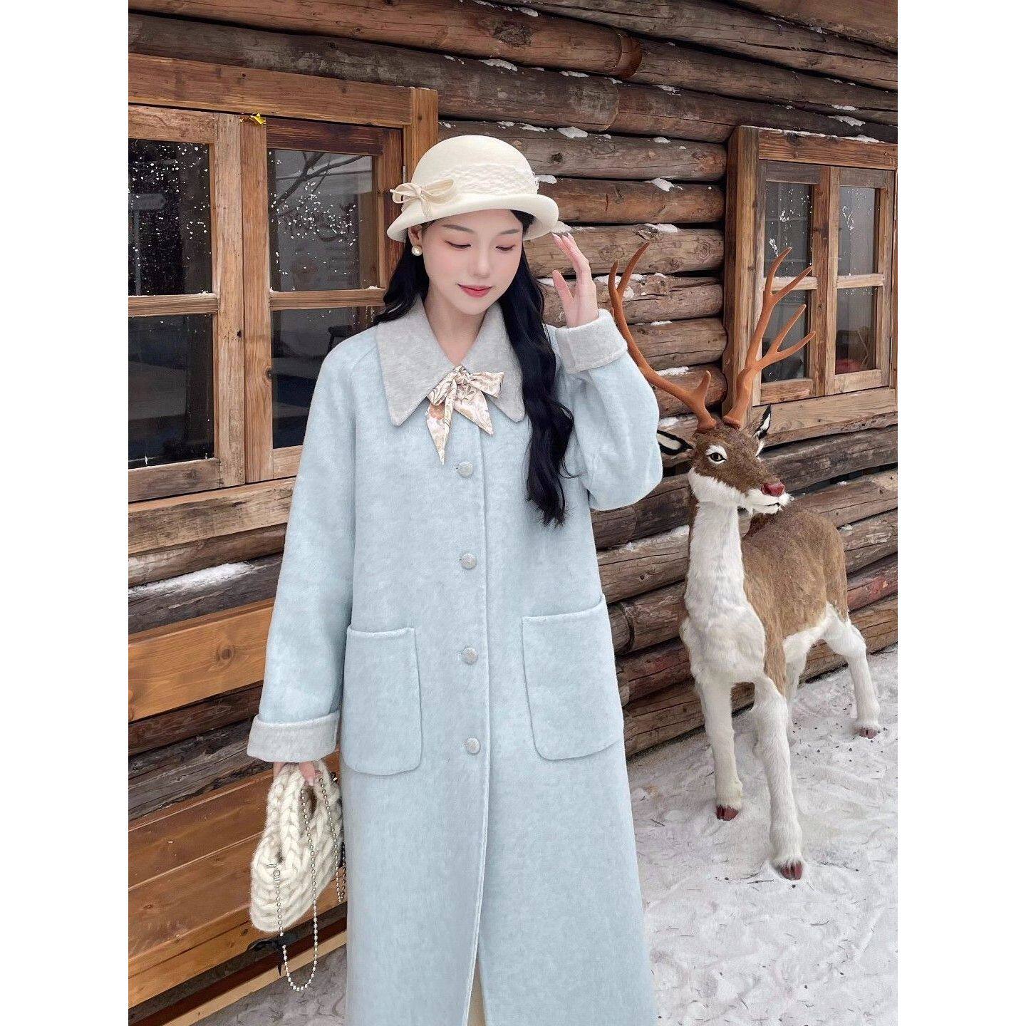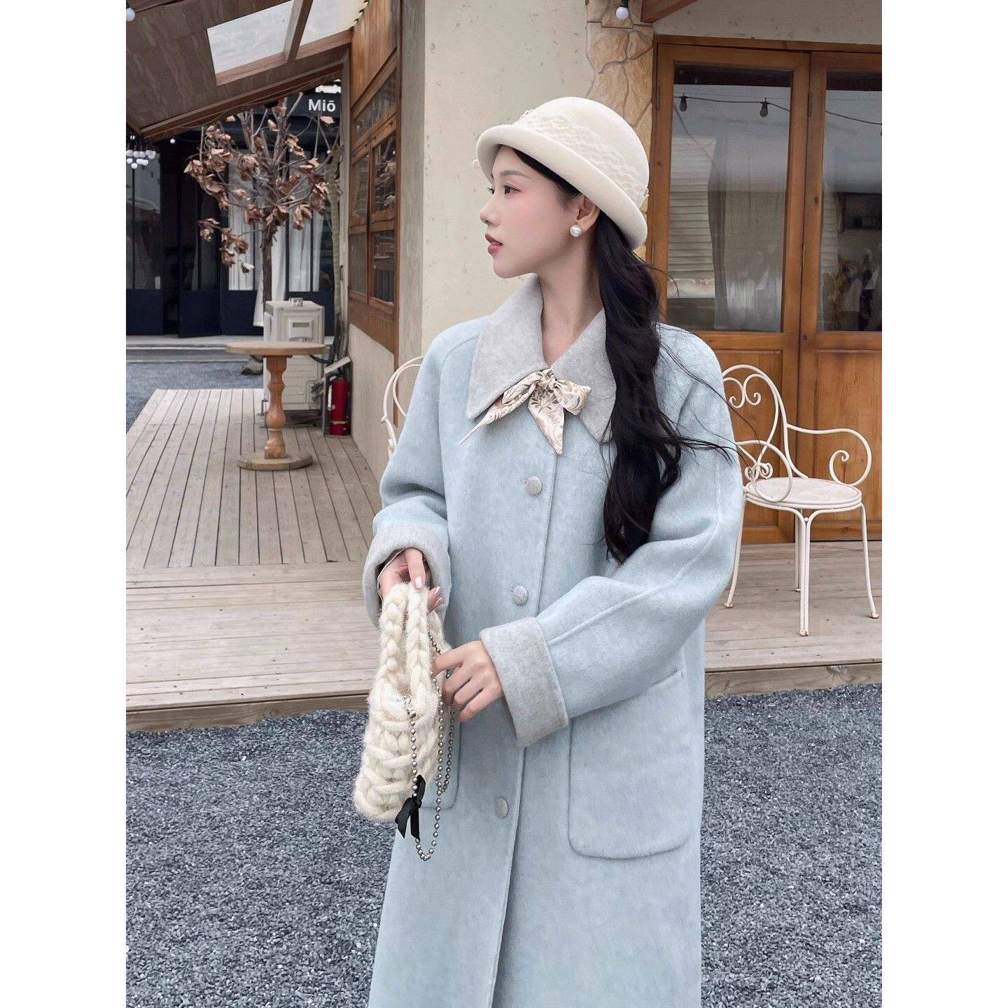 韩系气质拼接冰雪蓝中长款呢子大衣女25秋冬新款宽松显瘦保暖外套