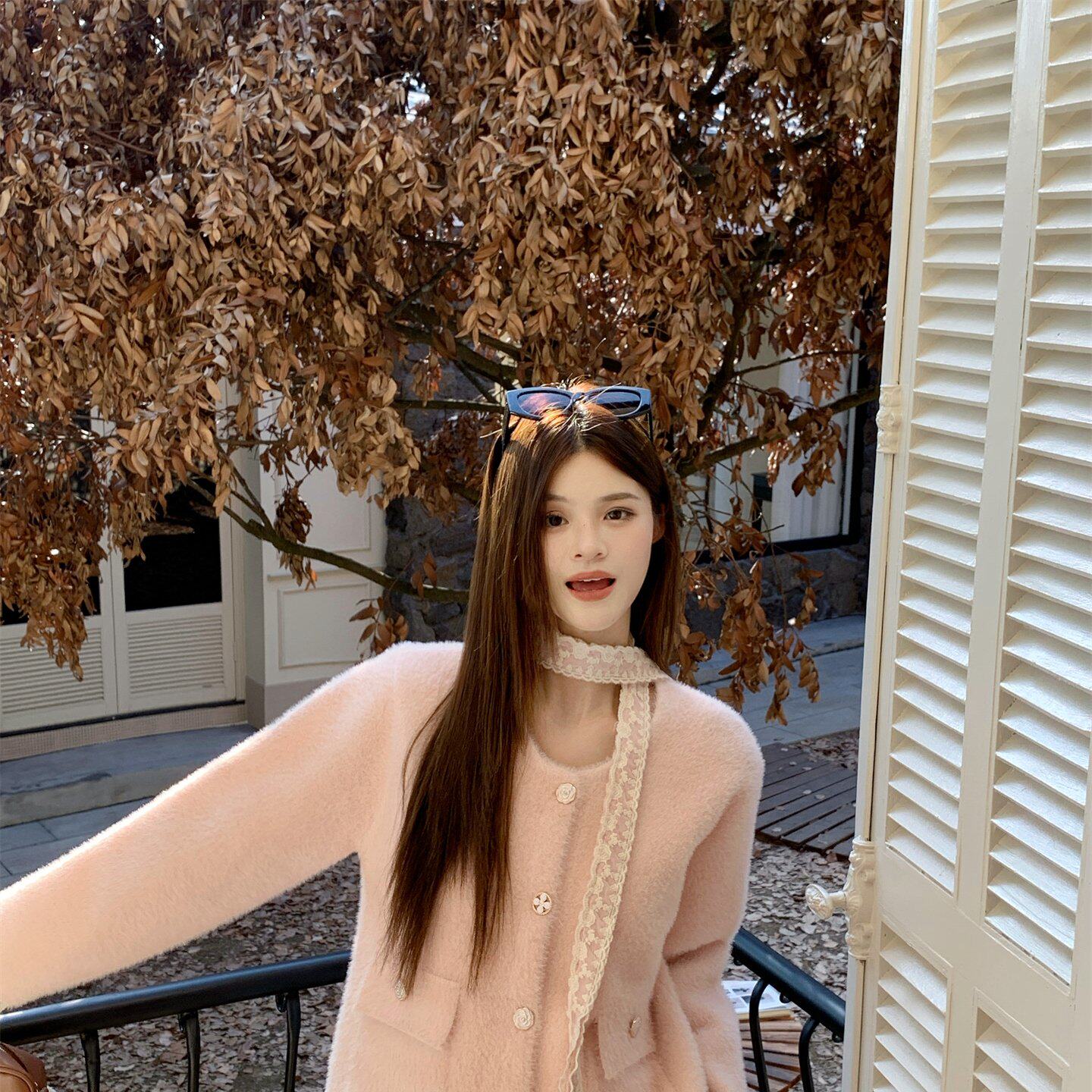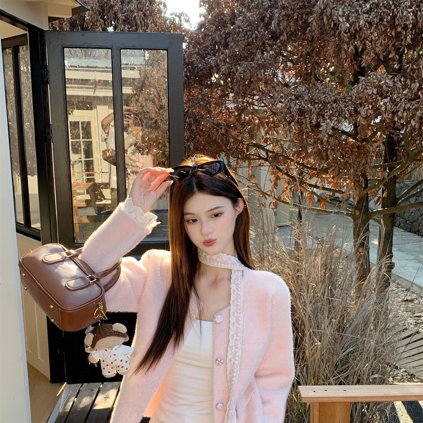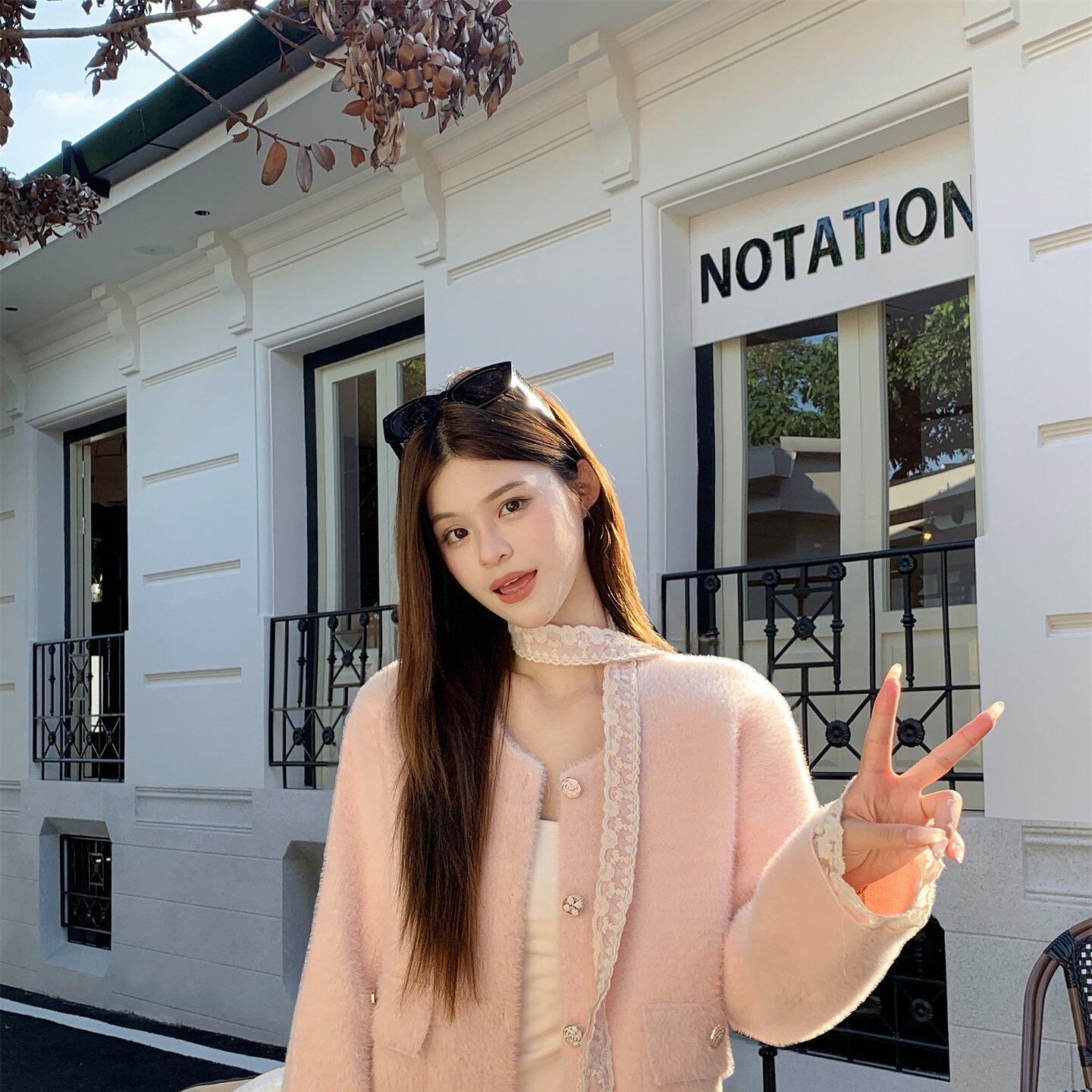 实拍 2025秋季新款小香风蕾丝花边拼接短款粉色外套女送飘带
