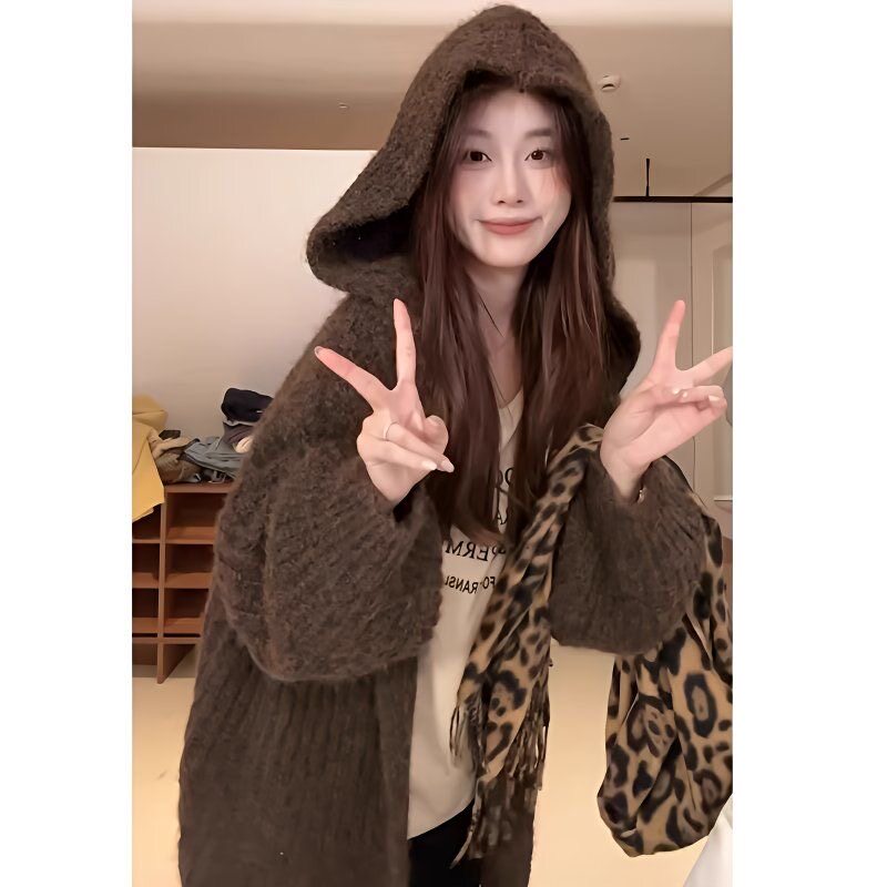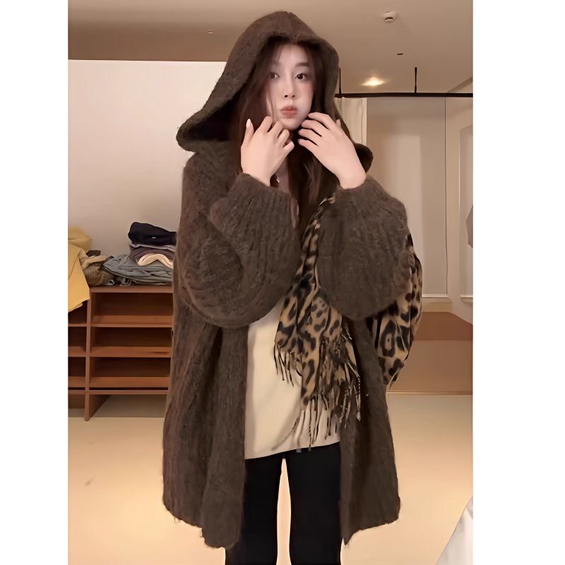 中长款慵懒风软糯连帽毛衣外套女秋冬季2025新款宽松加厚针织上衣