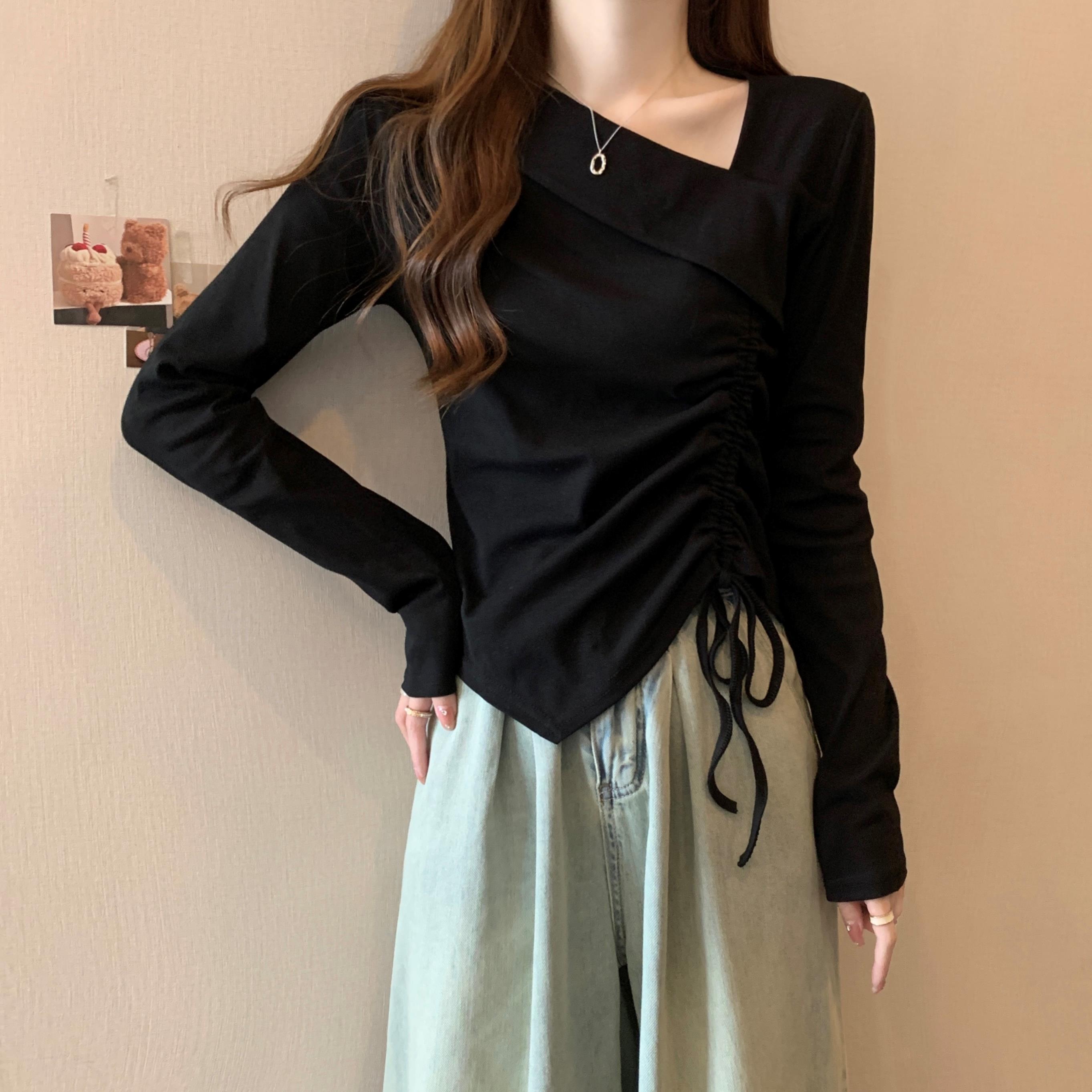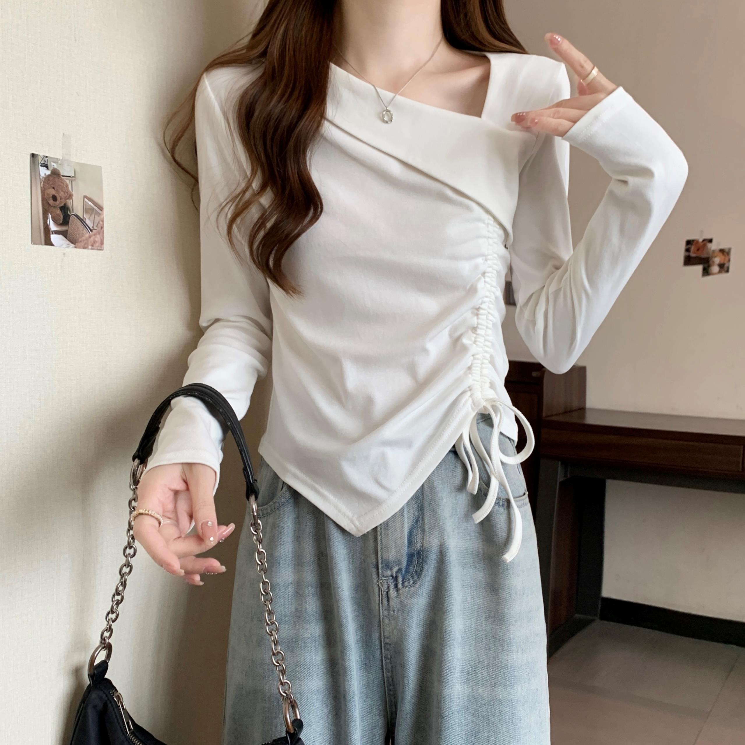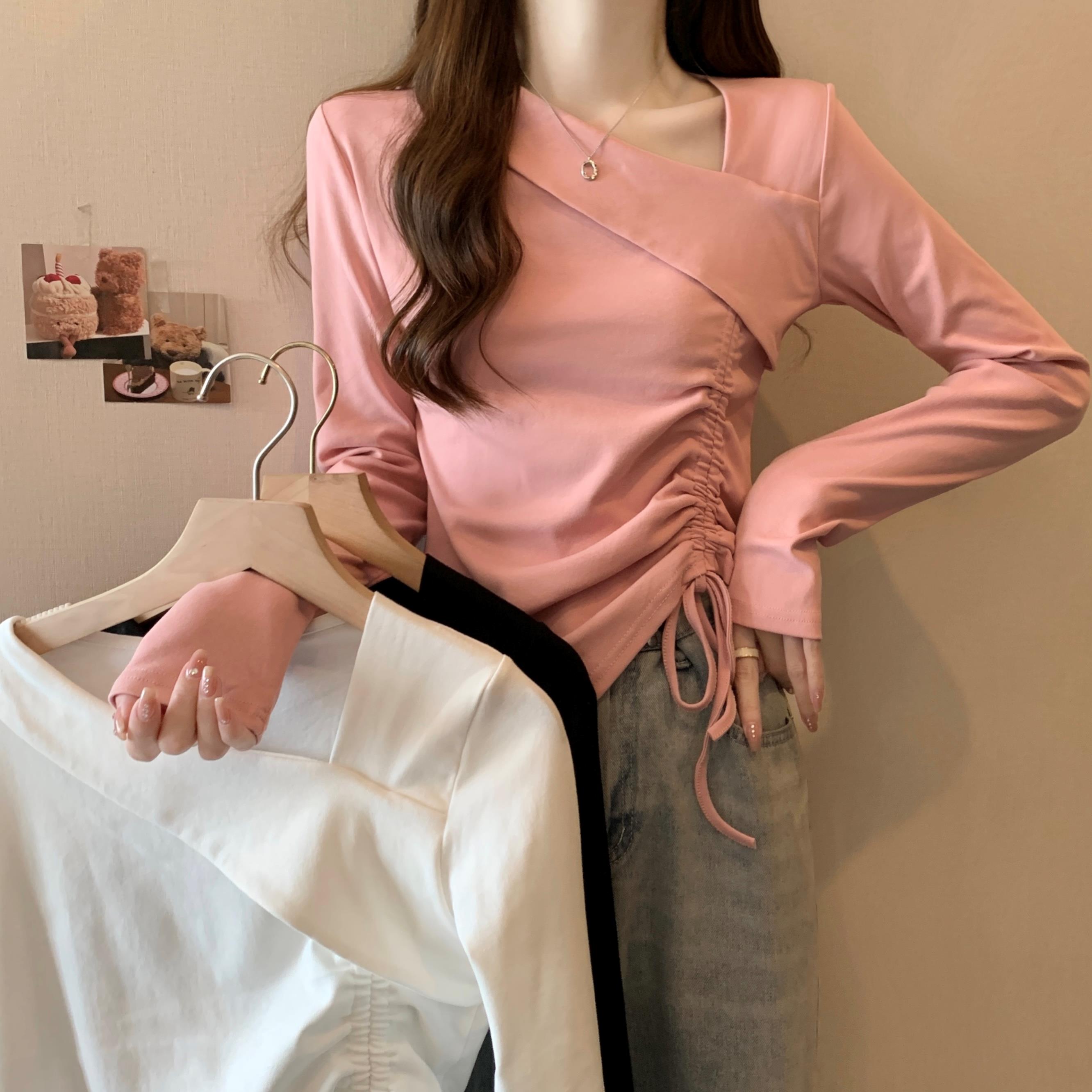 不规则V领正肩粉色长袖T恤女春季大尺码胖mm打底衫显瘦别致独特上