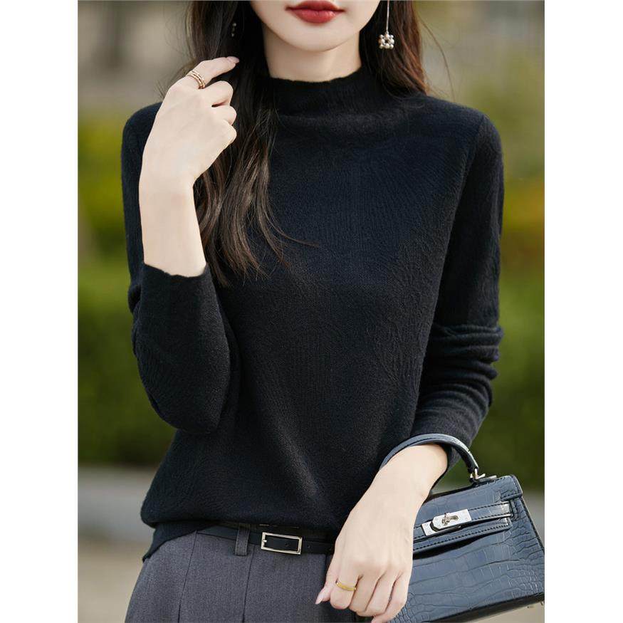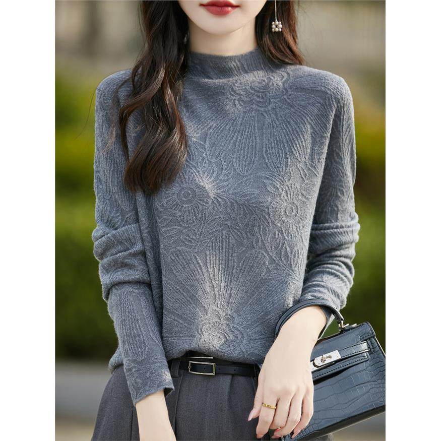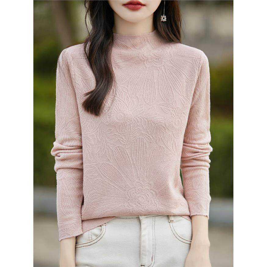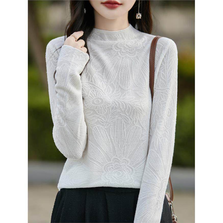 重工雕花长袖针织打底衫女2025新半高领套头精纺薄款保暖毛衣春秋