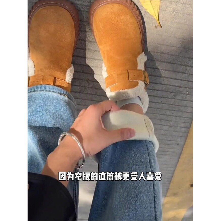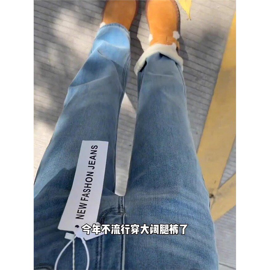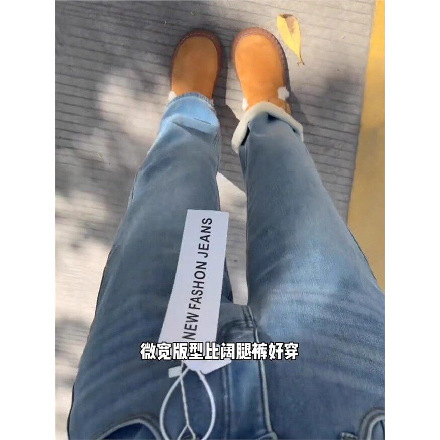 加绒加厚蓝色窄版直筒牛仔裤女春秋冬微胖梨形小个子显瘦阔腿裤子