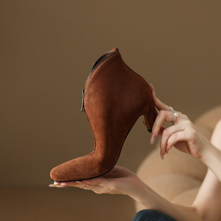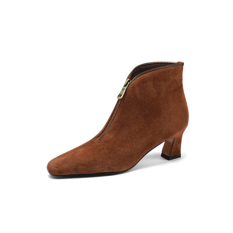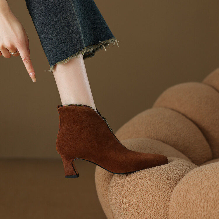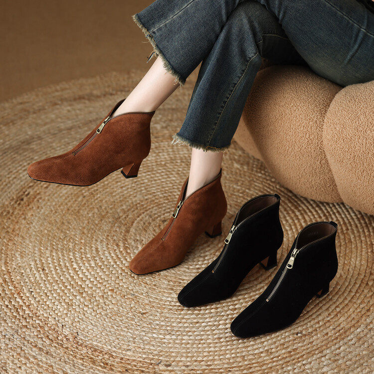 里外纯皮~5cm羊反皮秋冬真皮短靴女设计感前拉链时尚百搭粗跟靴子