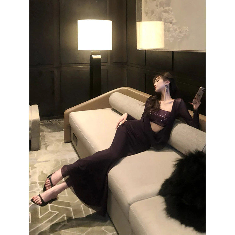 性感纯欲高级感垂折领抹胸洋装女夏季新款修身显瘦带胸垫包臀长裙