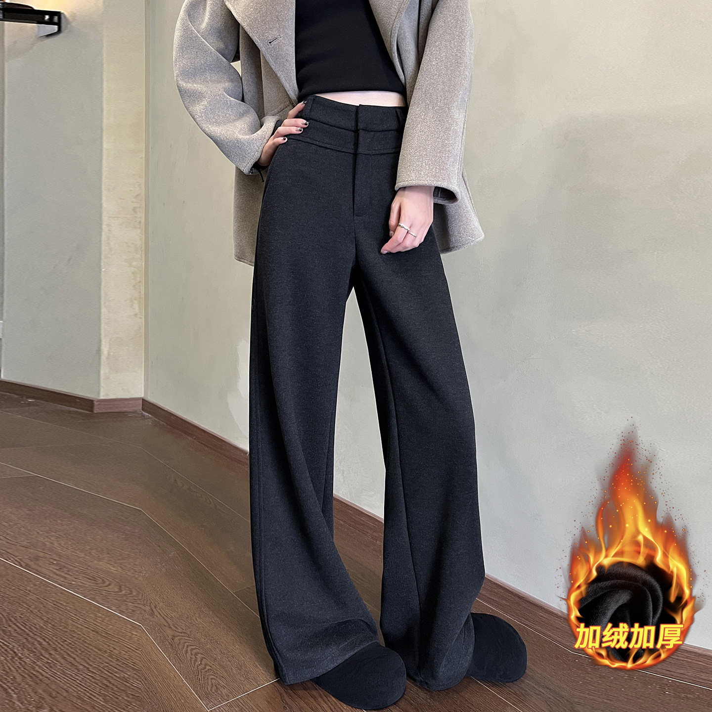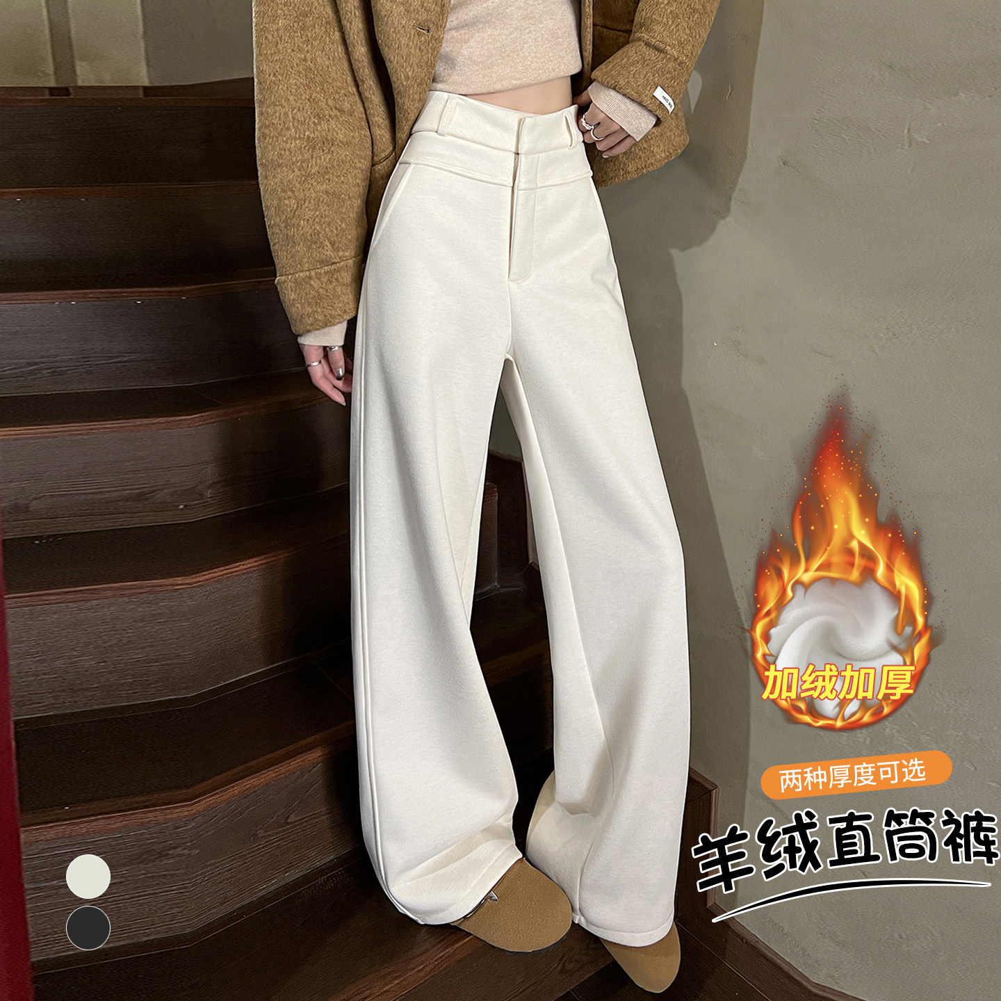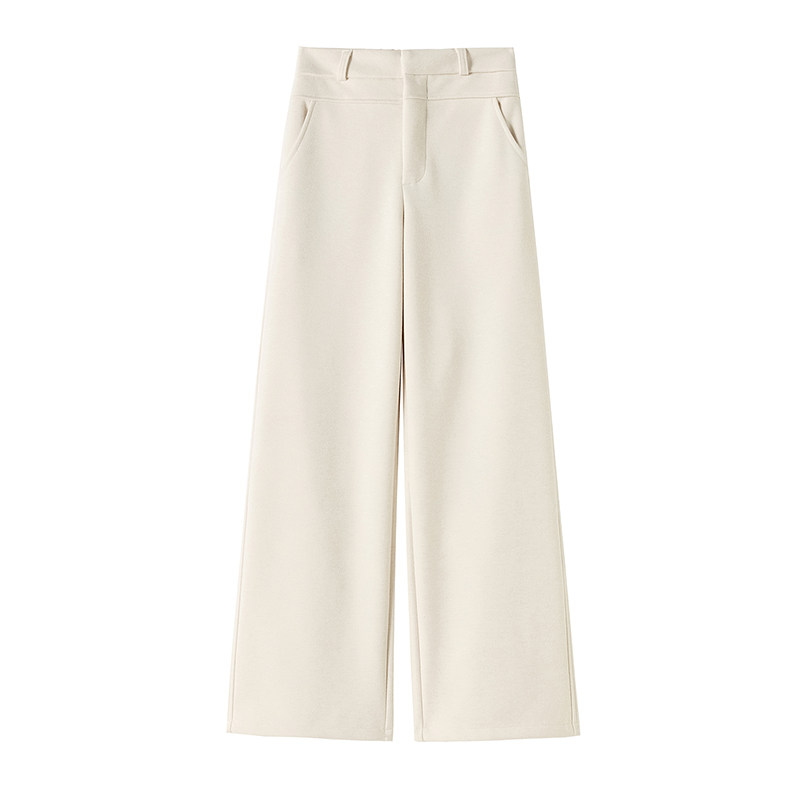 实拍 杏色羊绒阔腿裤女秋冬加绒加厚高腰垂感糯米直筒西装拖地裤