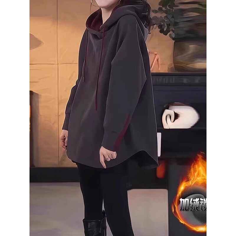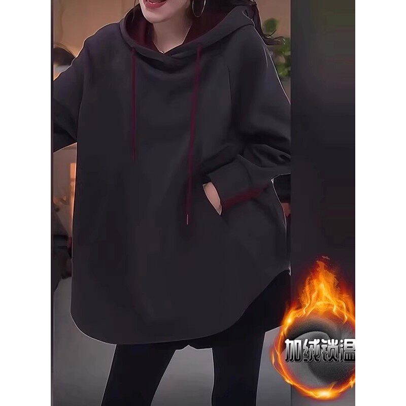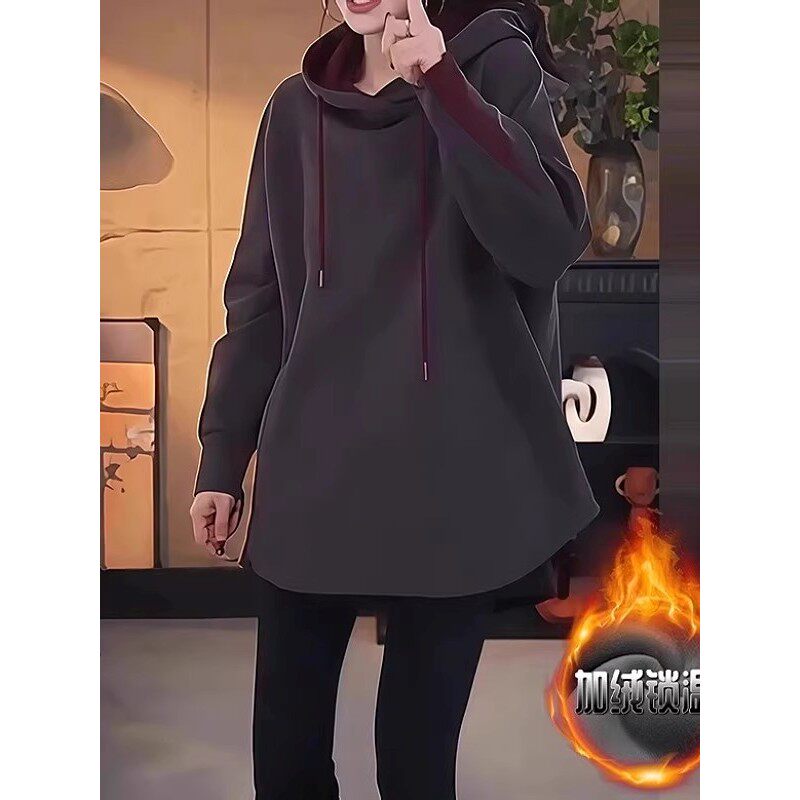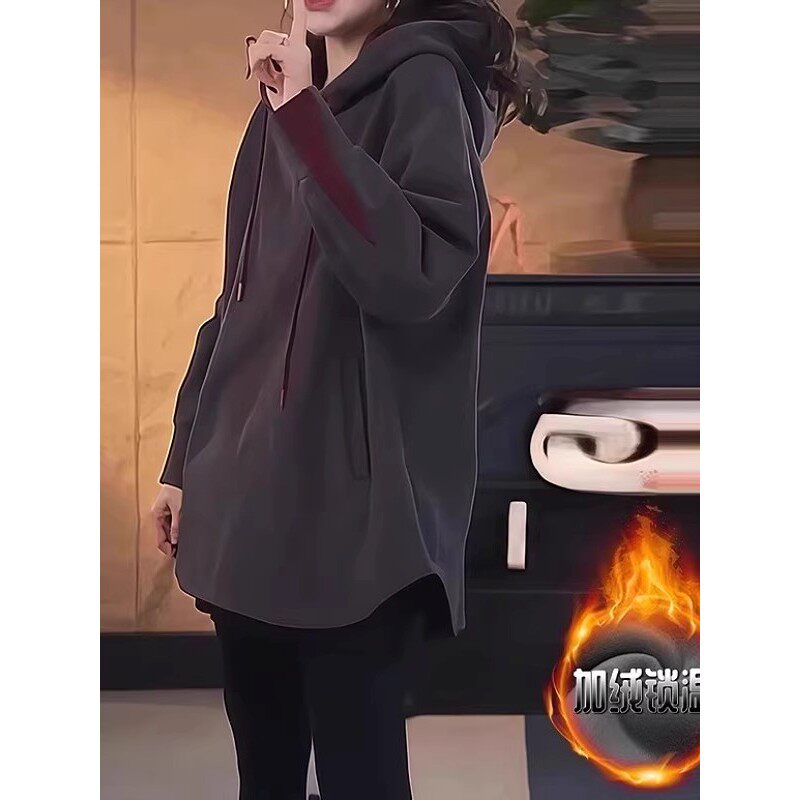 大码加绒加厚灰色连帽卫衣长袖女2025秋冬胖mm时髦洋气慵懒风上衣