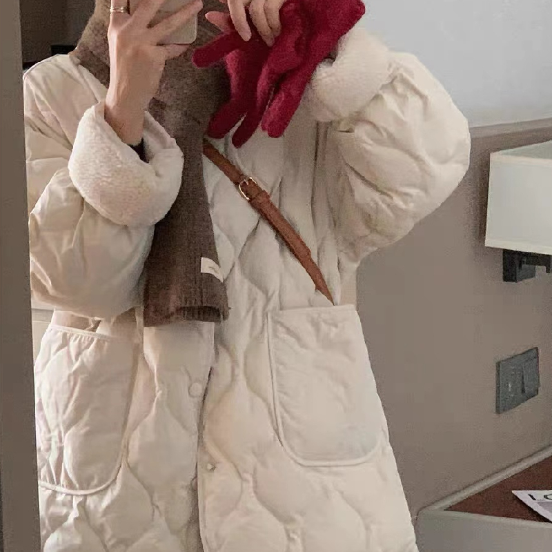 无领羊羔毛拼接轻薄菱形格冬韩版宽松小香风菱格保暖棉衣棉服女