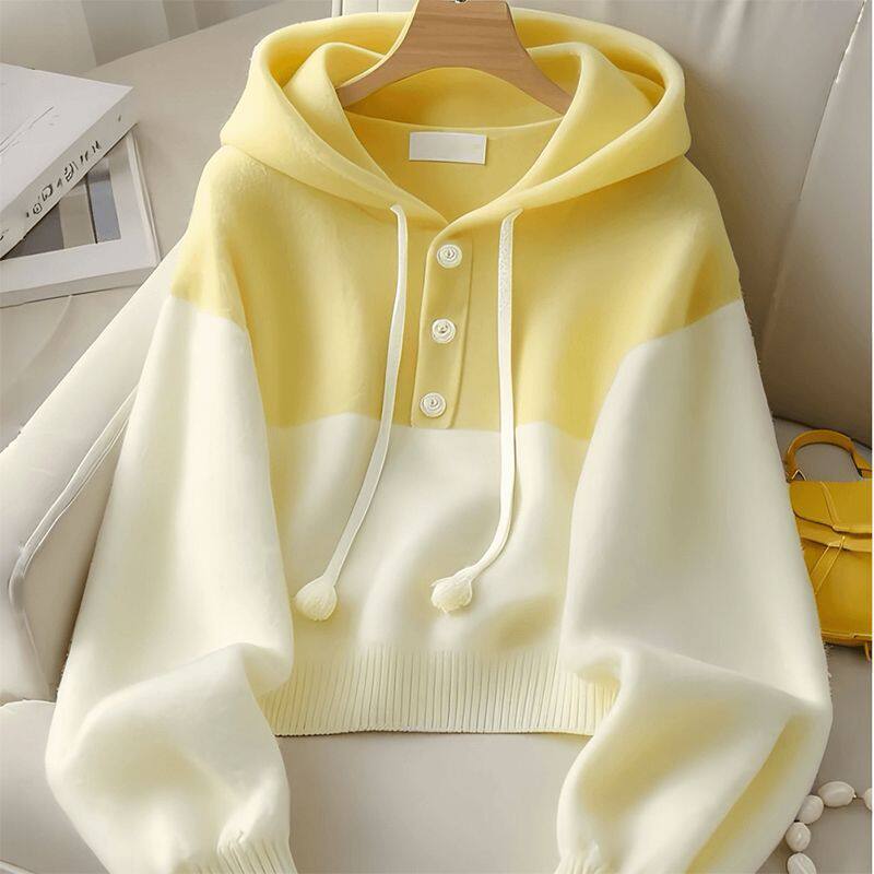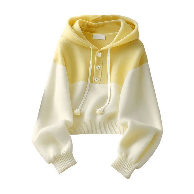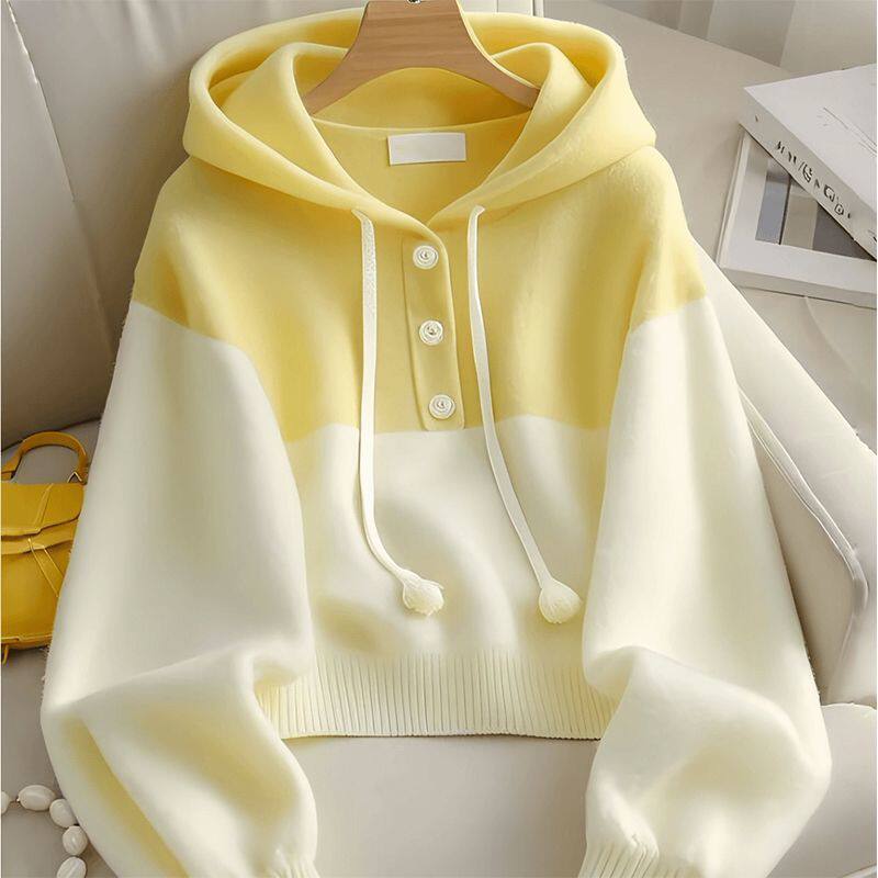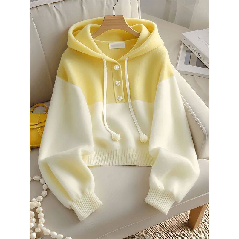 黄白拼接撞色连帽针织衫毛衣女卫衣韩系慵懒风秋冬穿搭高级感上衣