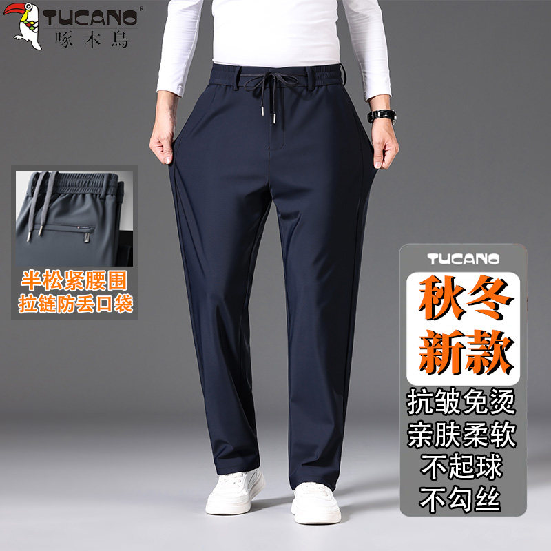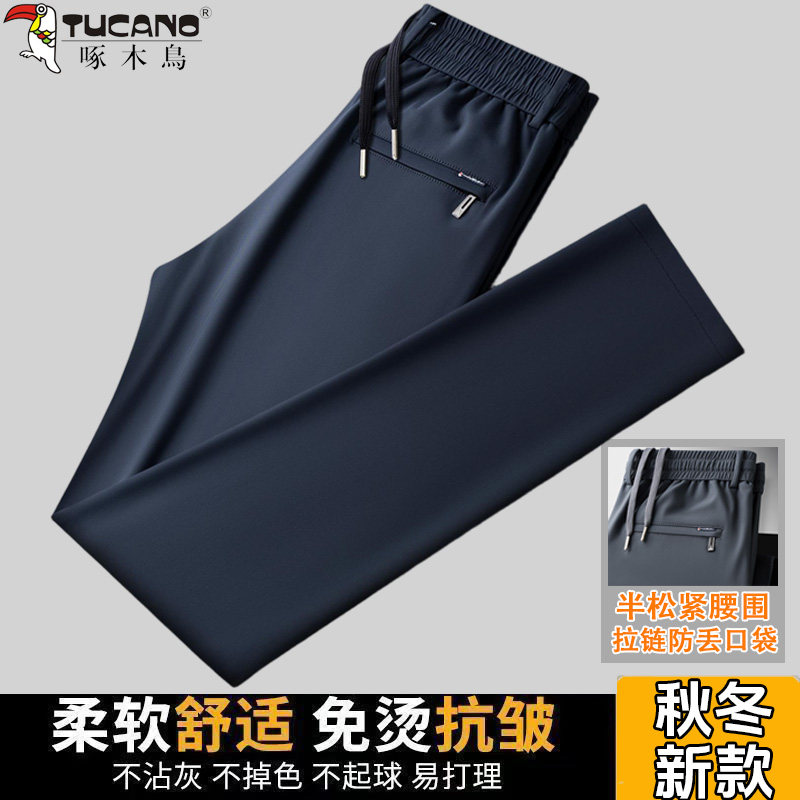 啄木鸟秋冬加厚加绒保暖半松紧腰休闲裤宽松直筒抗皱免烫休闲裤