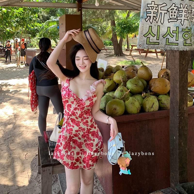 吊带衣裙女连夏裙高级感玫瑰印花YS08251绑带收a字性感露背度假风