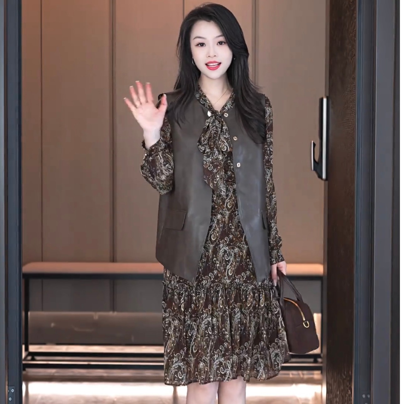 秋季实拍欧美式雪纺腰果花图案轻奢百搭宽松A字中长款连衣裙女装