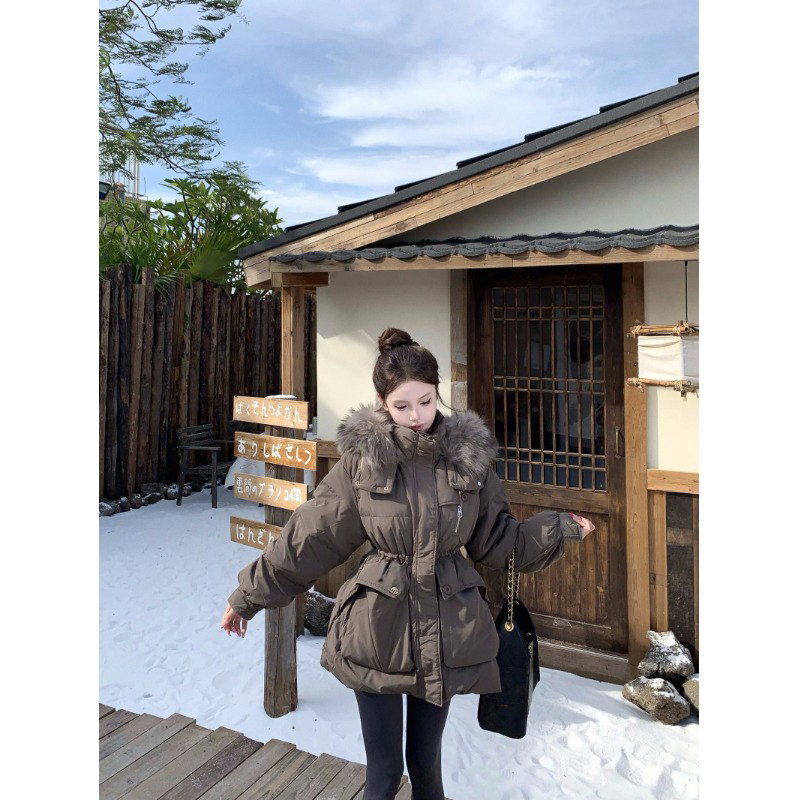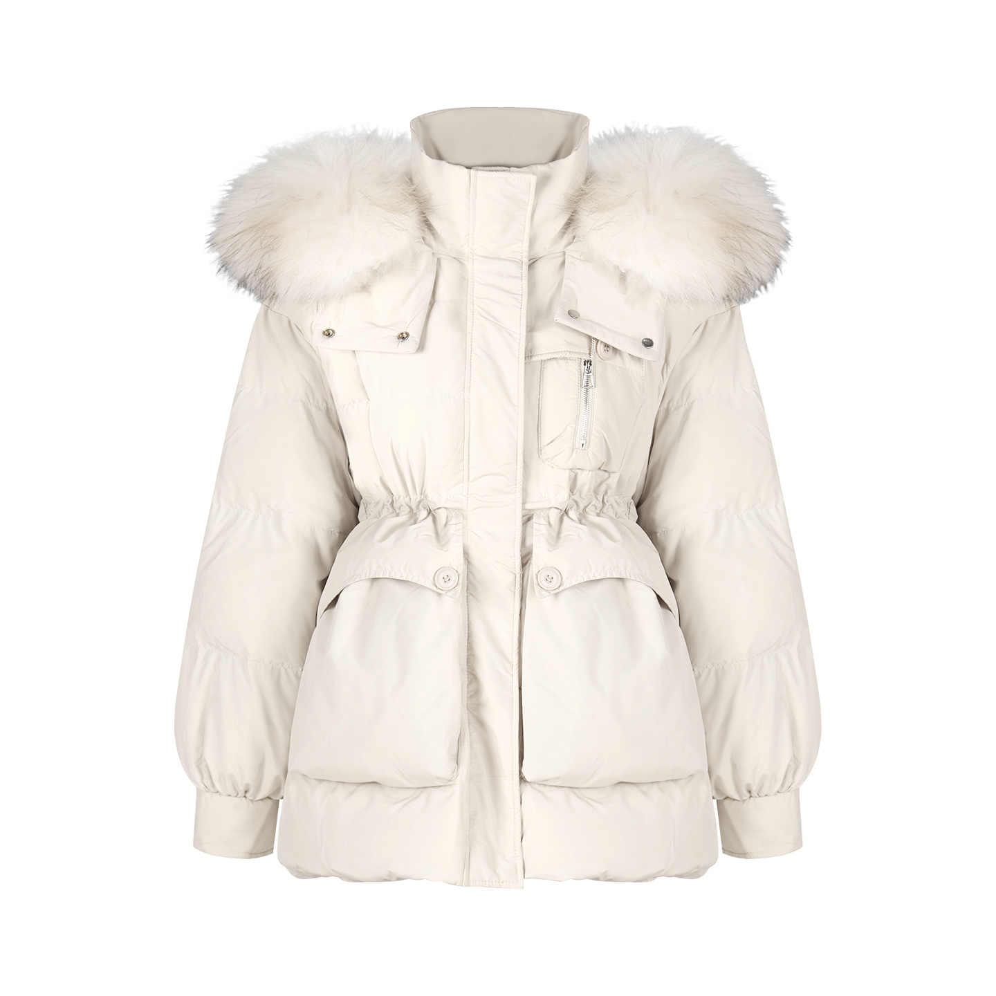 米白色毛领连帽羽绒服女冬季2025新款加厚保暖设计感中长款外套