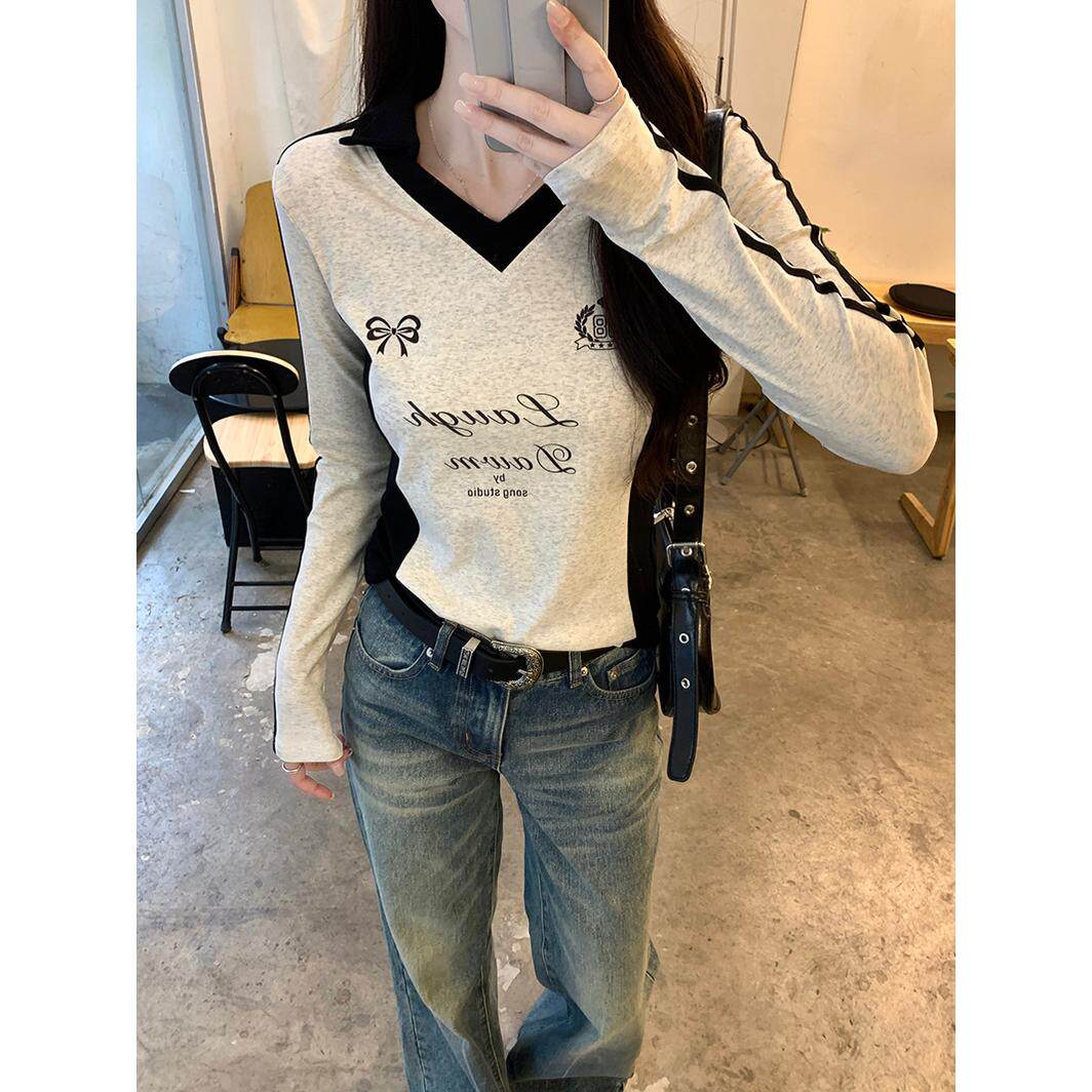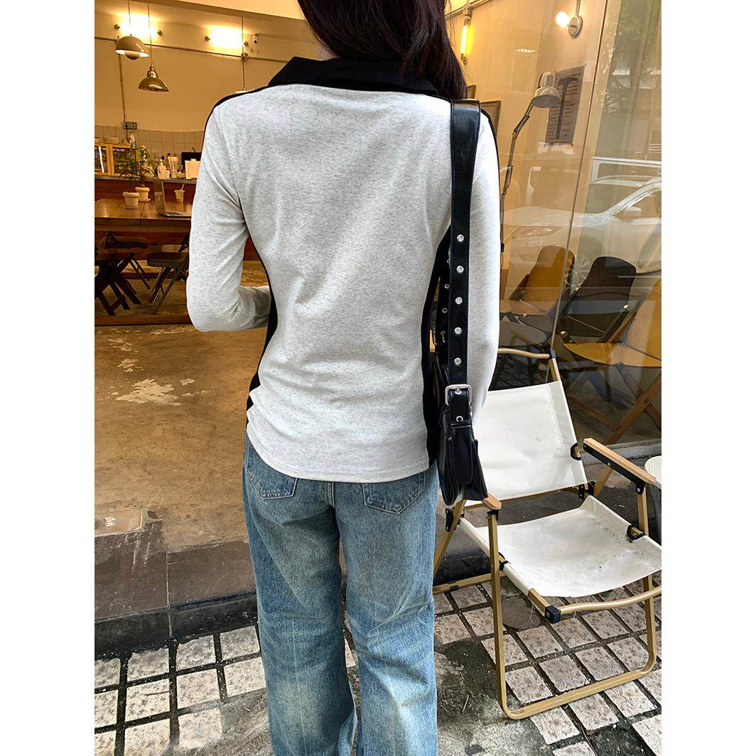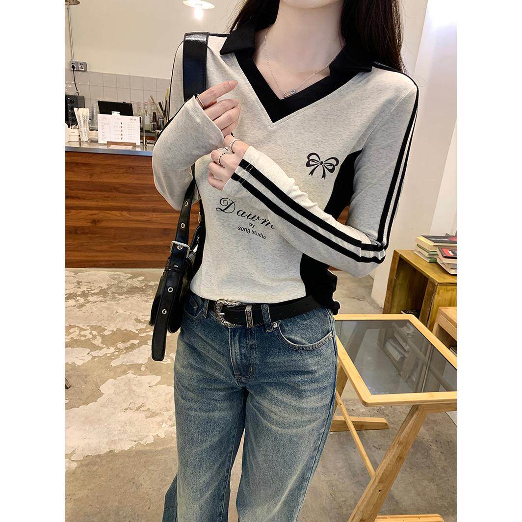 实拍螺纹210克长袖t恤女2025秋季新款薄撞色翻领潮打底衫上衣