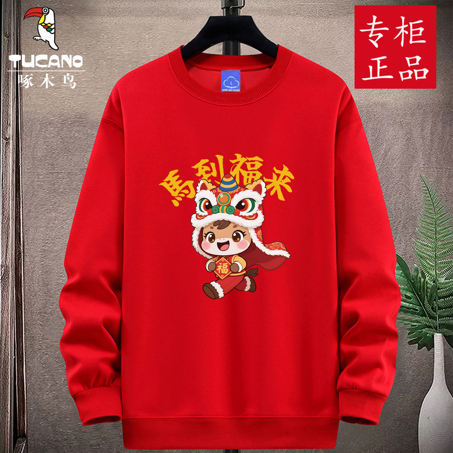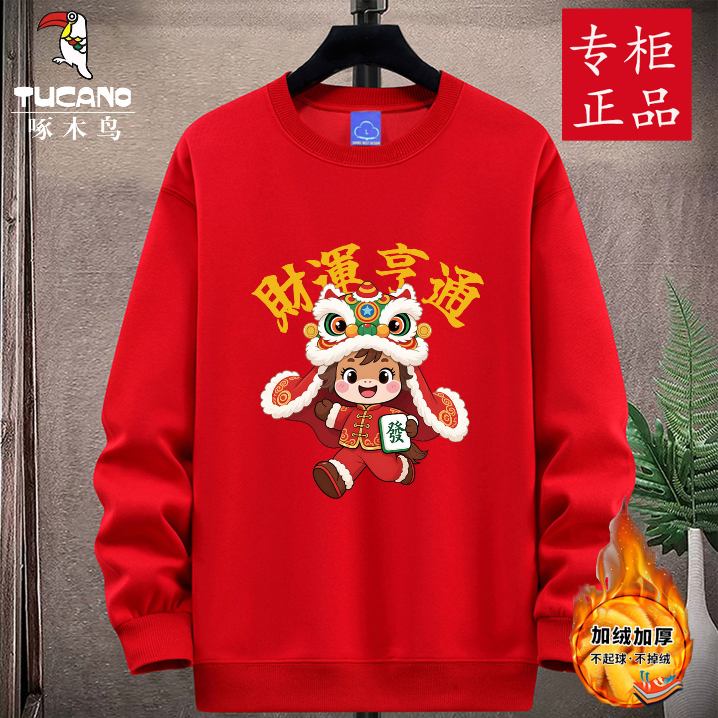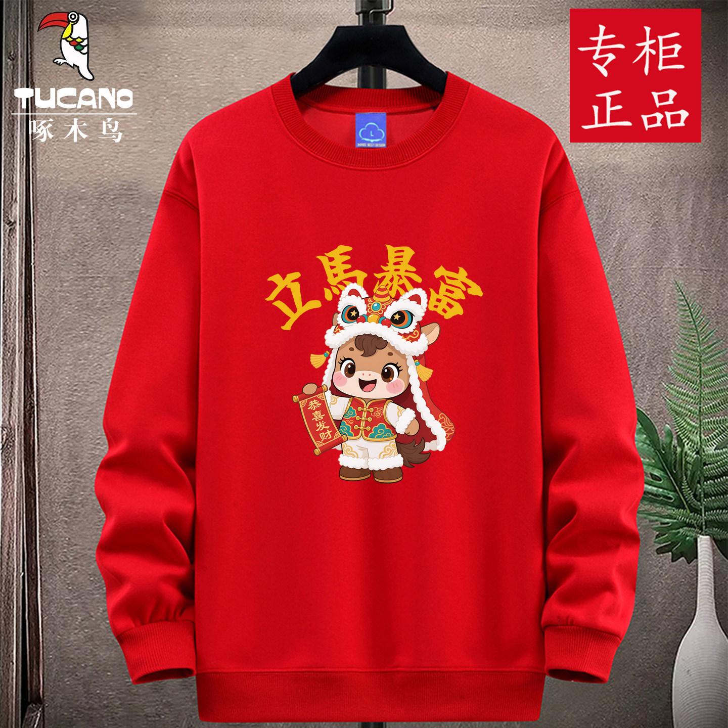 啄木鸟马年本命年大红色圆领卫衣男套头打底衫加绒外套春秋冬团购
