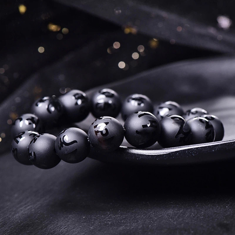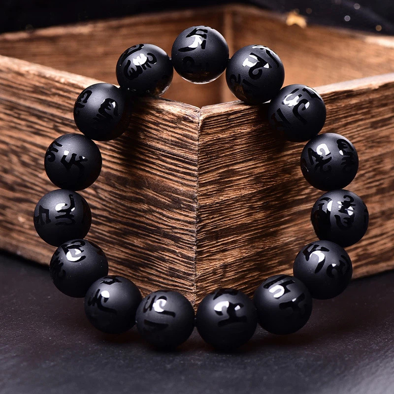 天然黑玛瑙六字真言心经手链磨砂黑水晶手串念珠黑玛瑙石佛珠男女
