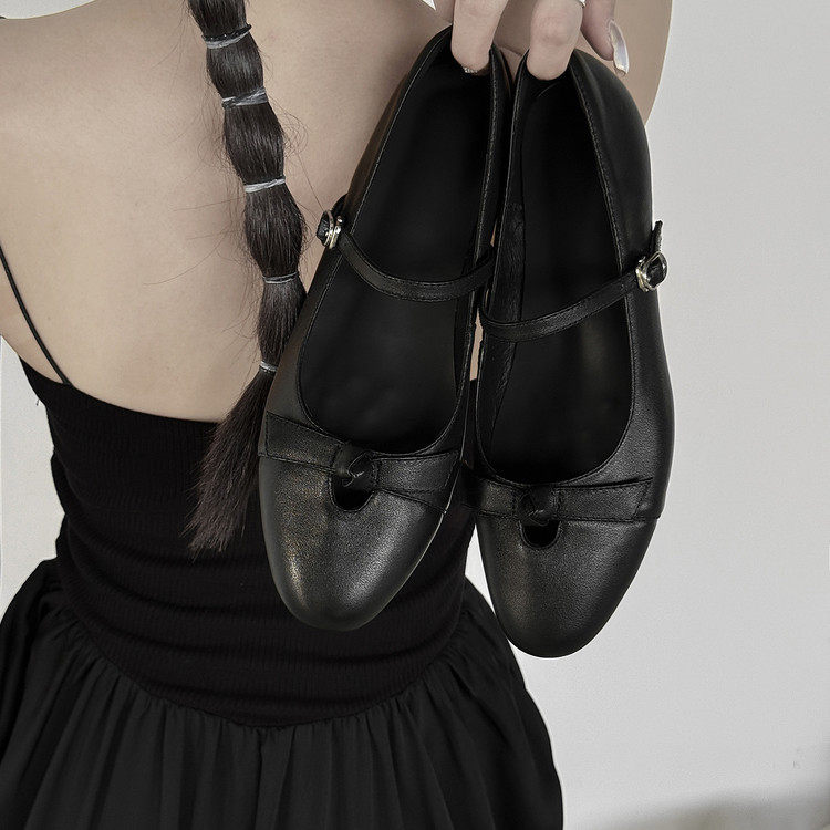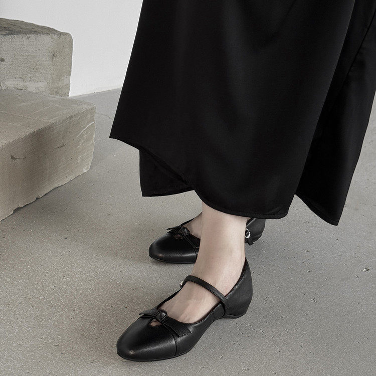 复古牛皮内增高玛丽珍单鞋女2025秋季新款蝴蝶结一字带浅口小皮鞋