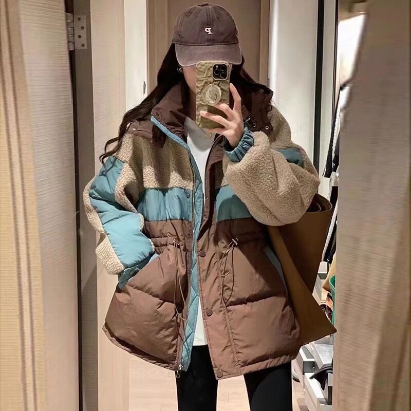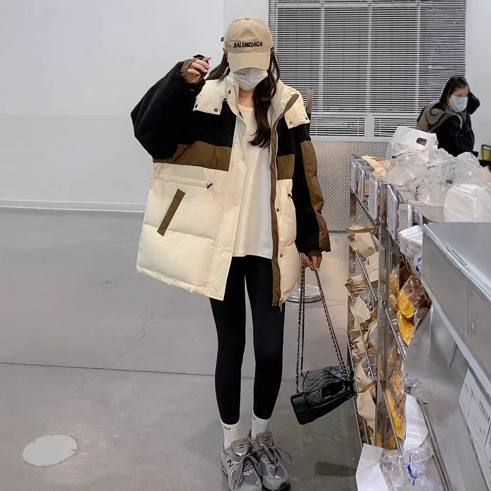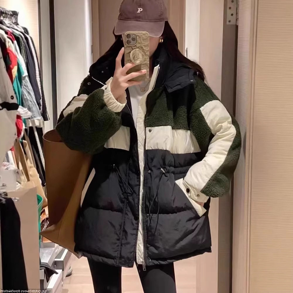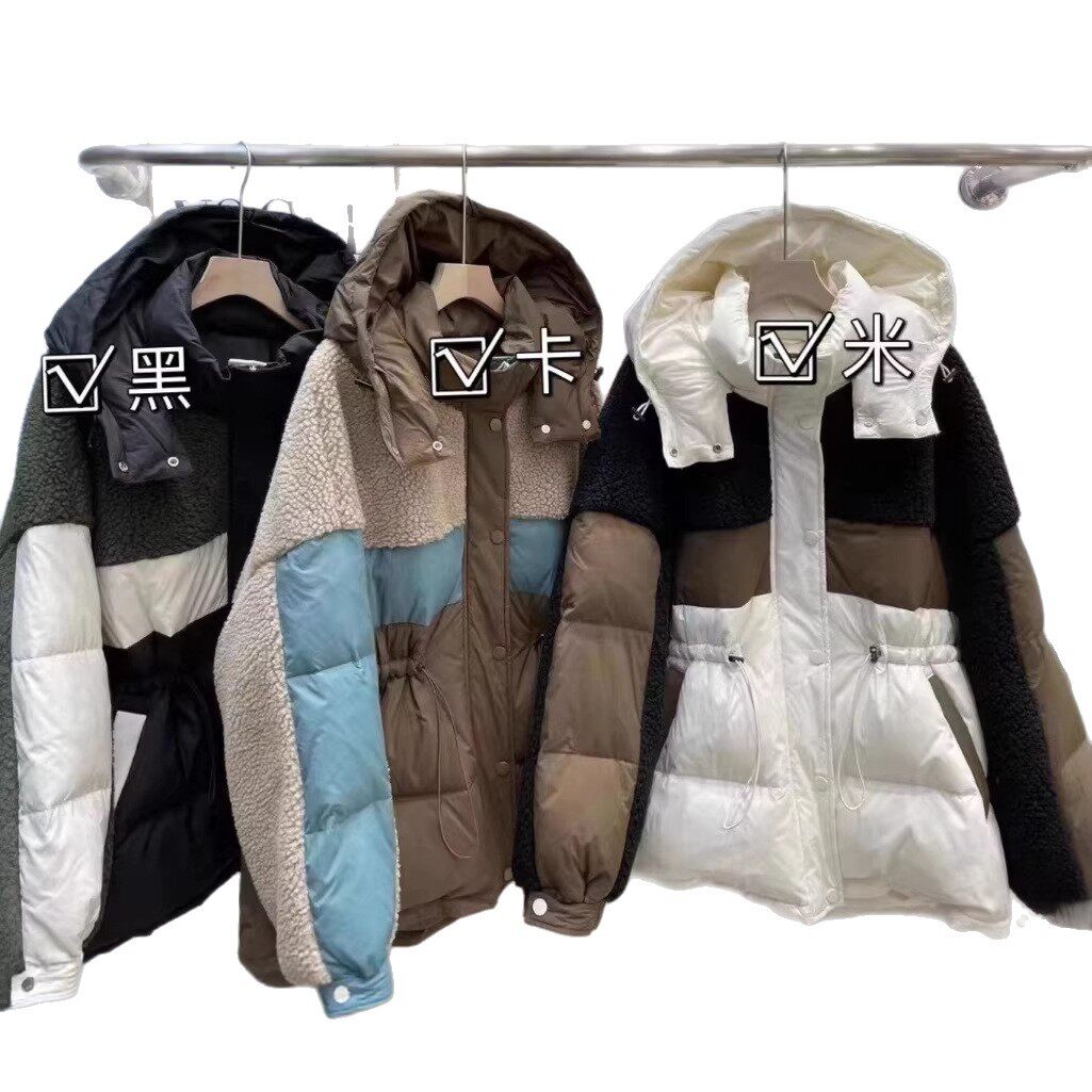 2025冬季羊羔毛拼接羽绒服女抽绳收腰白鸭绒加厚外套撞色中长款
