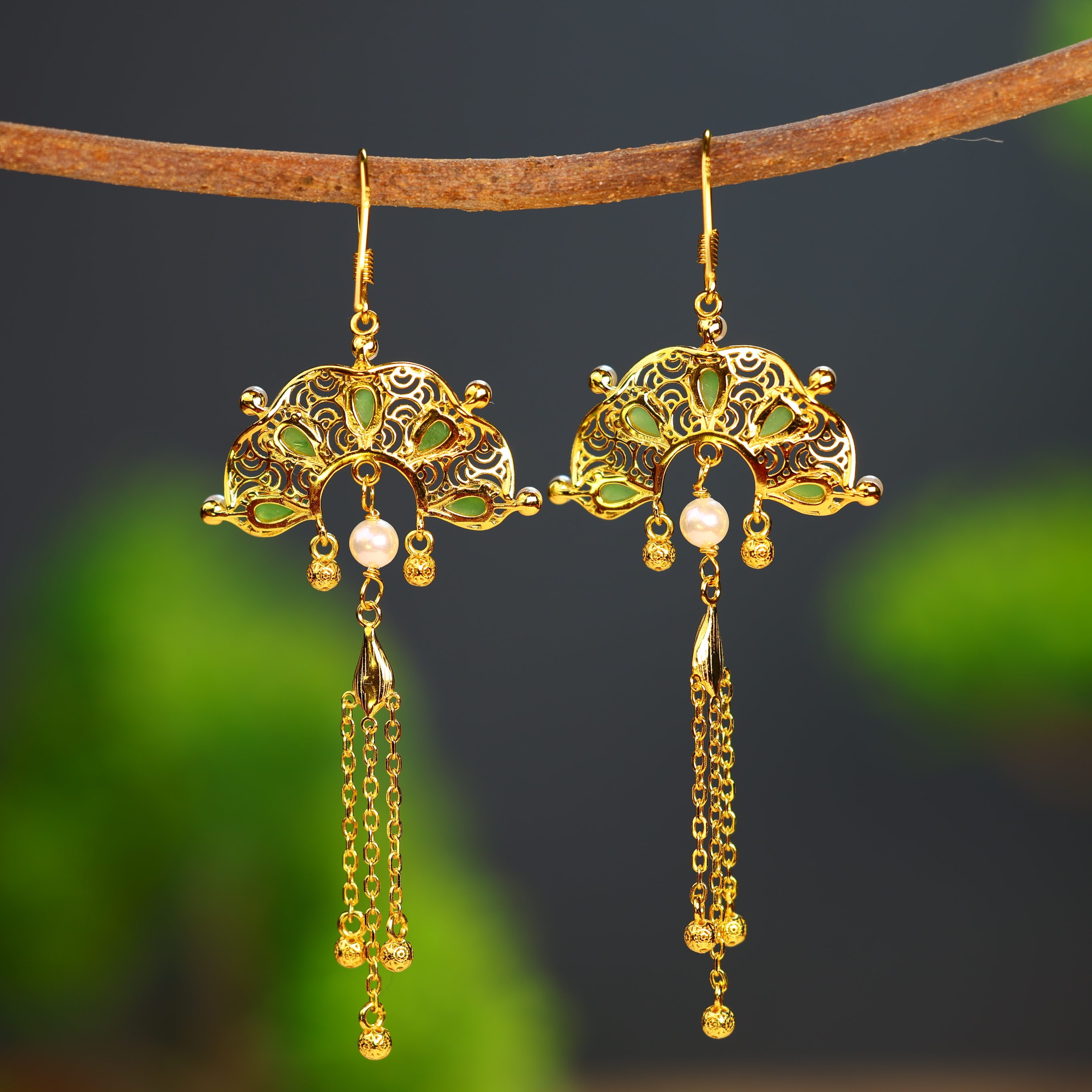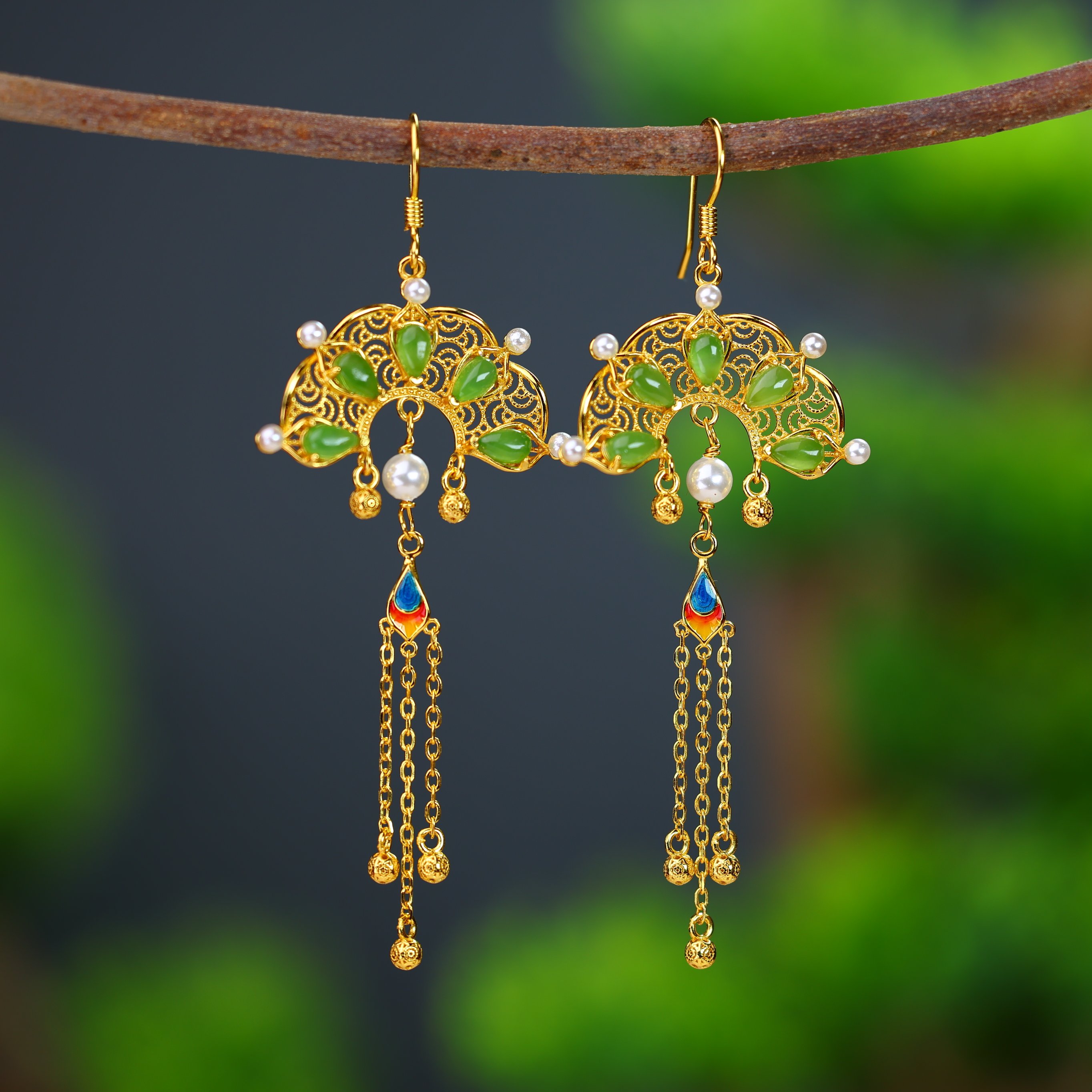 天然和田玉碧玉925银镶嵌水滴蛋面珐琅扇形流苏耳坠耳环