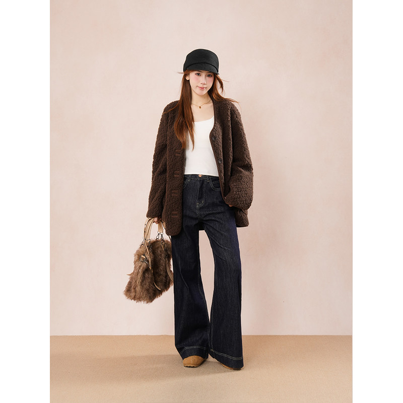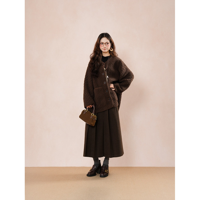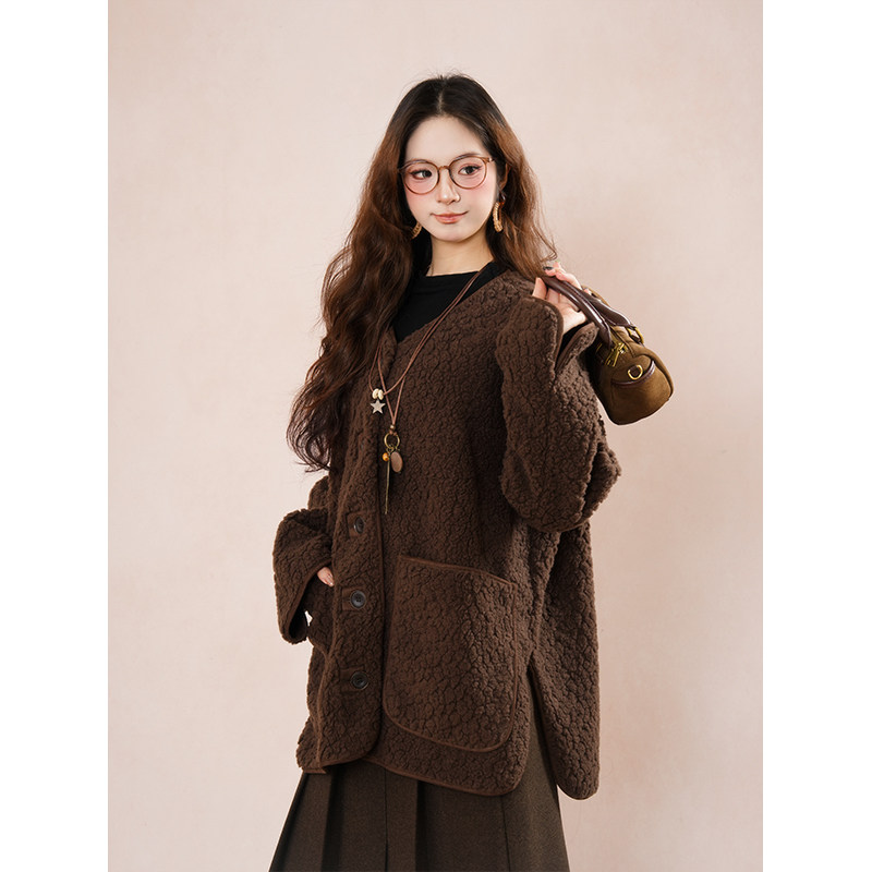 棕熊假期 复古棕色羊羔毛短外套女秋冬遮肉宽松显瘦毛毛保暖外套
