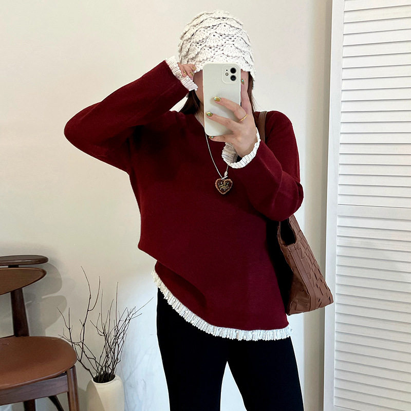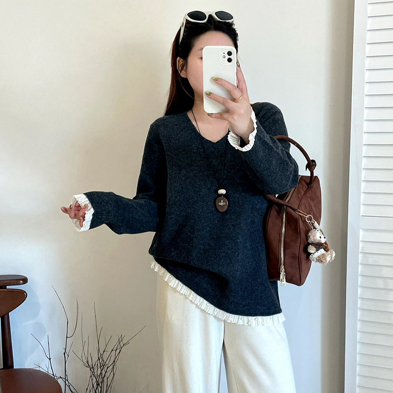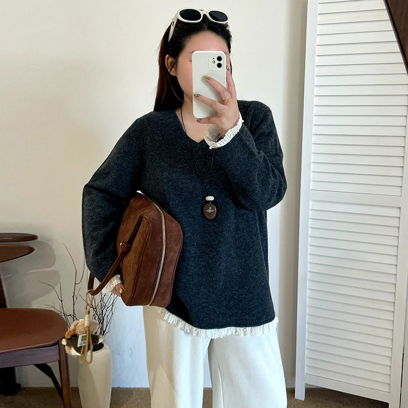 大码女装撞色拼接花边上衣女宽松软糯毛衣2025冬胖mm针织衫23570