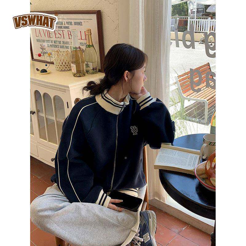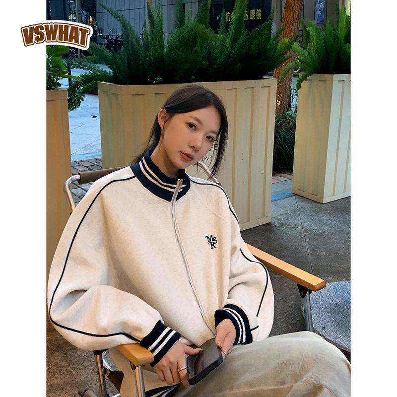 Vs what韩 版松弛感棒服女休闲开球衫立领上衣夹春秋5571情侣款克