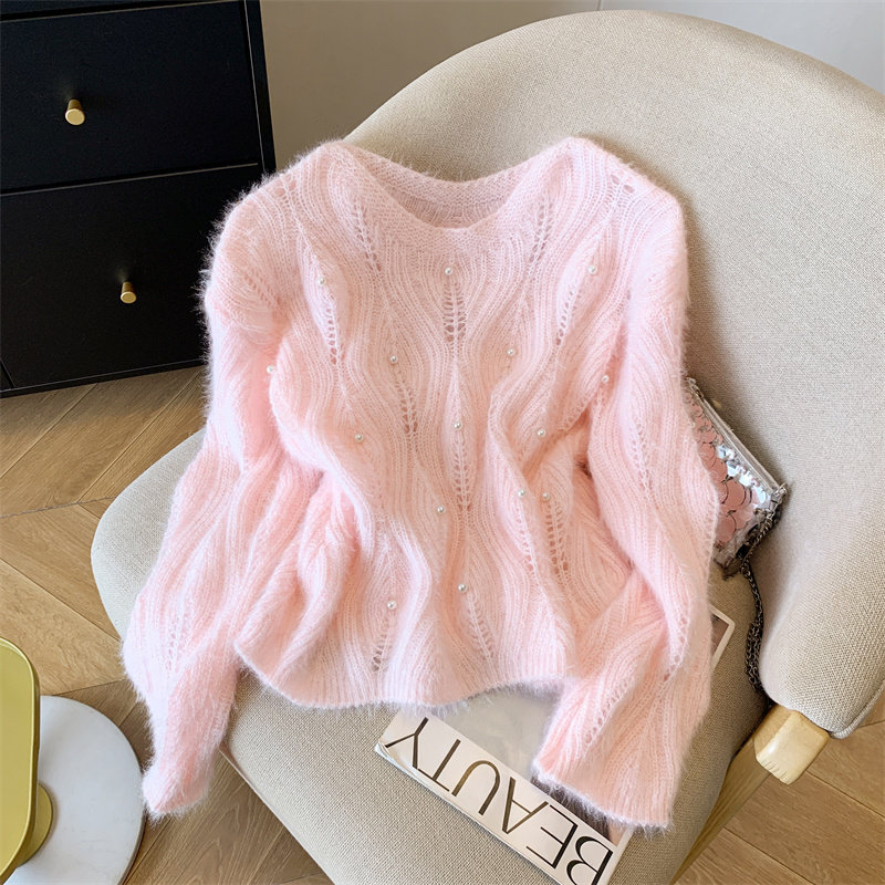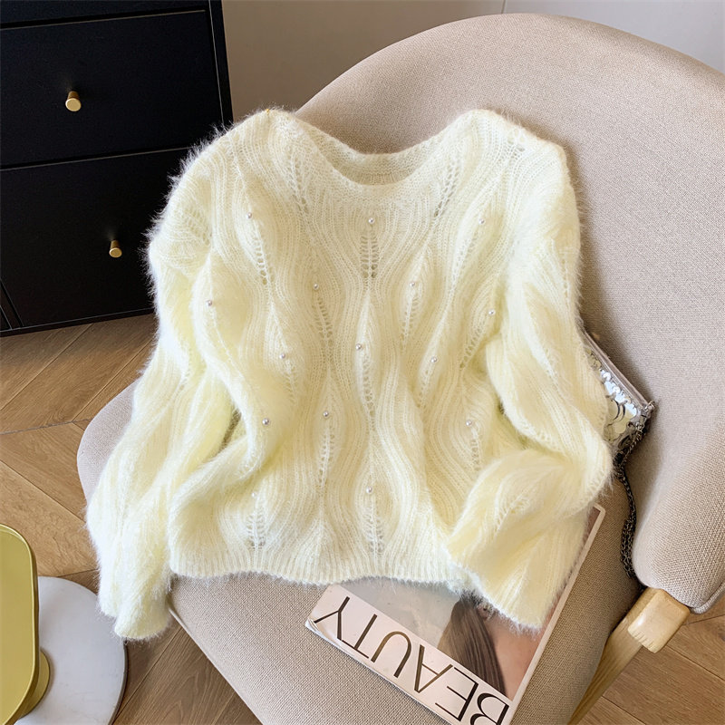 漂亮马海毛白色镂空钉珠毛衣女秋冬慵懒风软糯重工百搭休闲针织衫