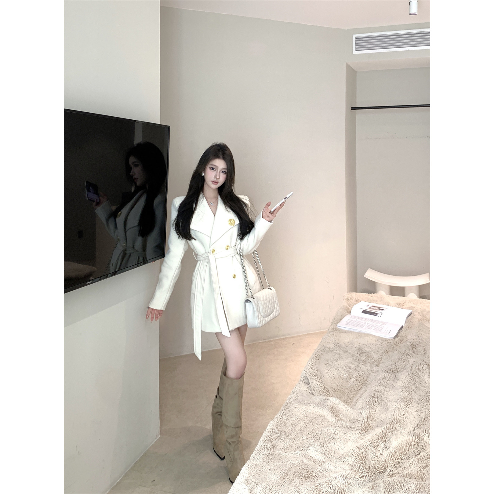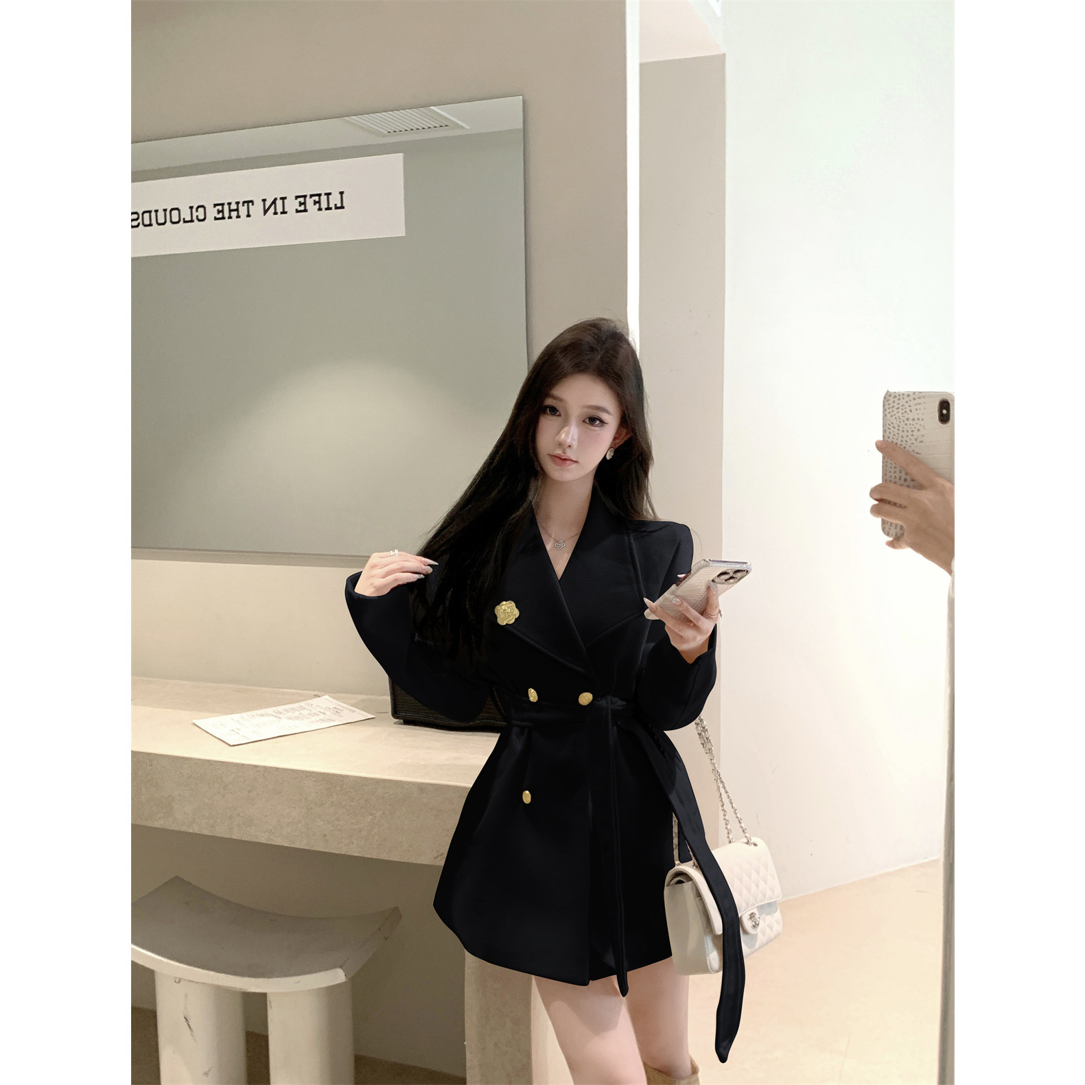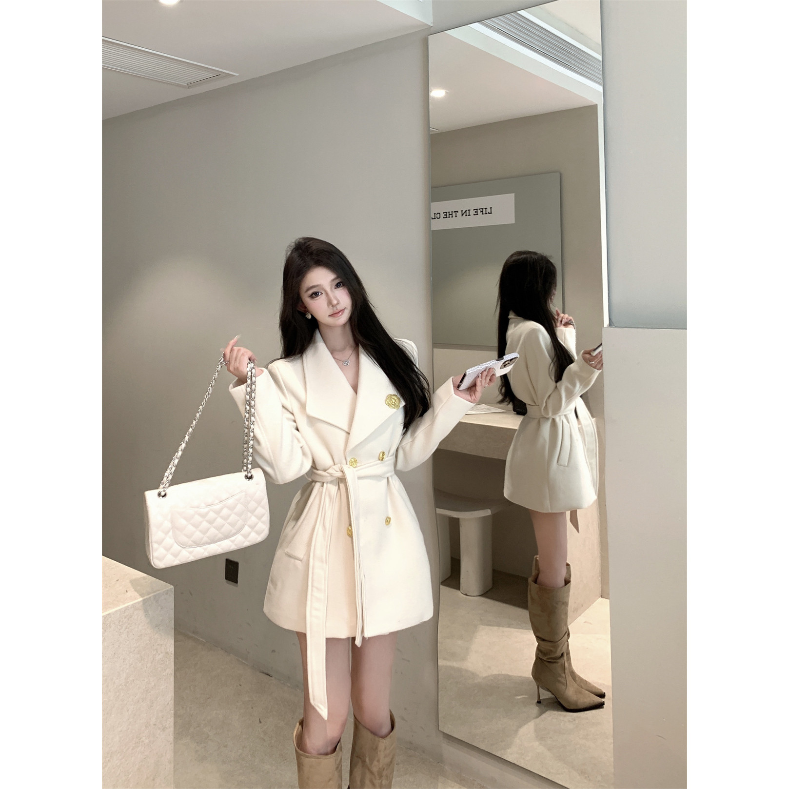 2025新款实拍实价 金色花朵大翻领双排扣系带夹棉毛呢西装外套