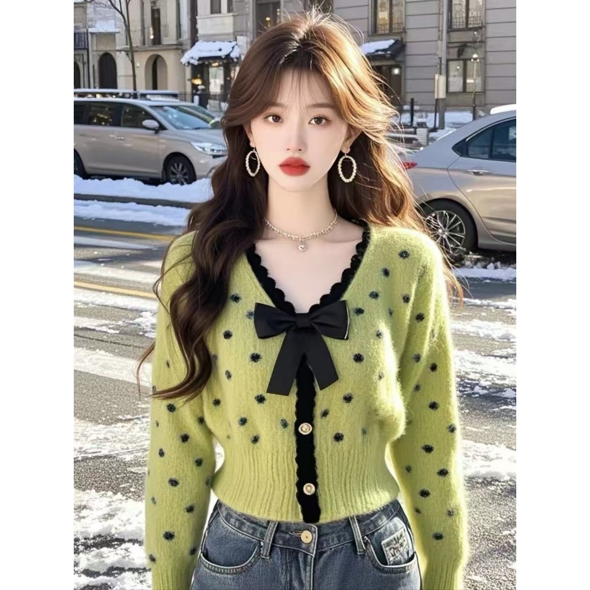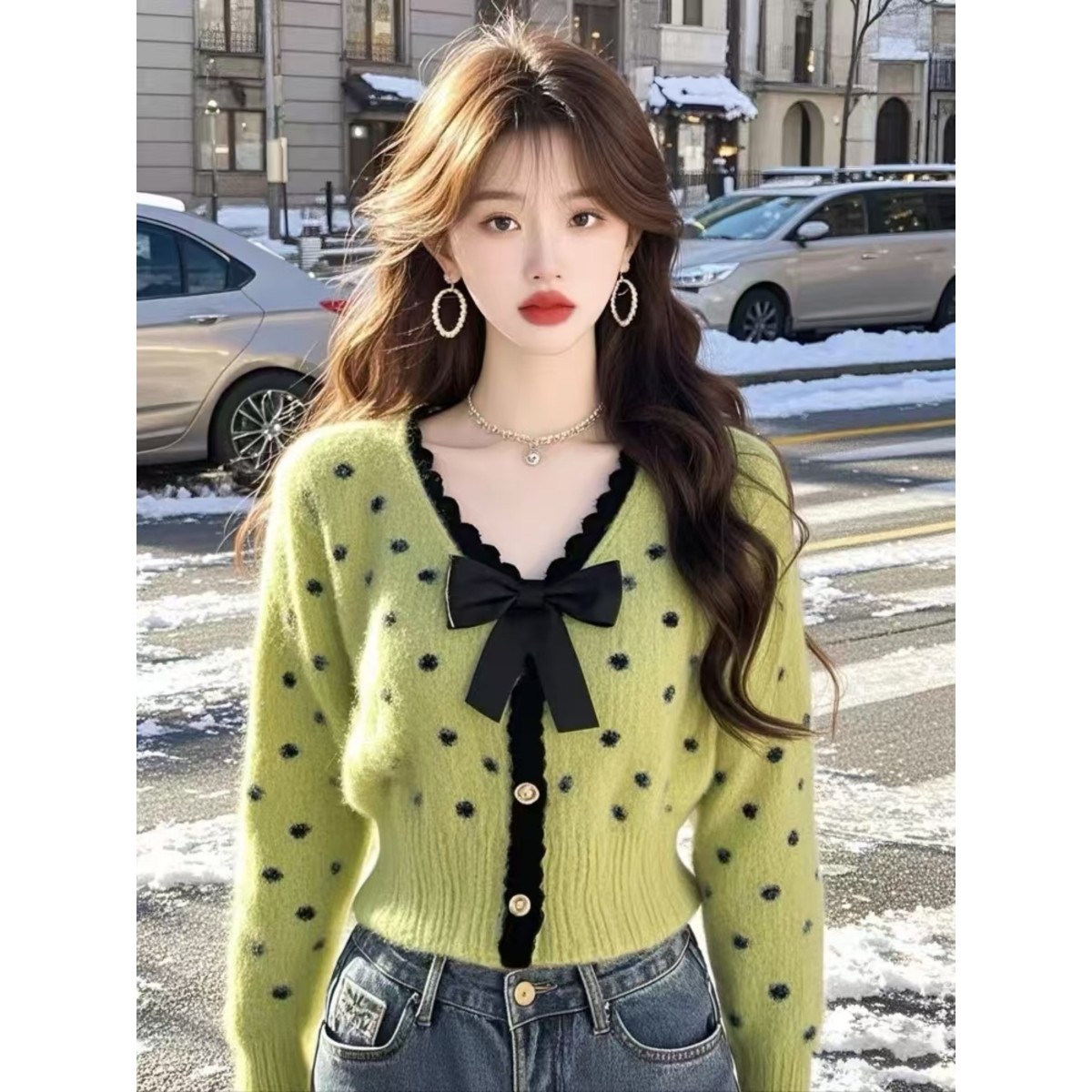 冬季爆款流行高级感韩系独特漂亮绿色波点毛茸茸打底毛衣