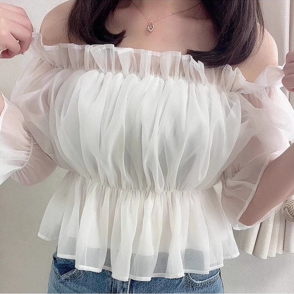 首页> 女装> D11048日单新款客供料花边松紧一字领套头显瘦女薄款甜美短款衬衫