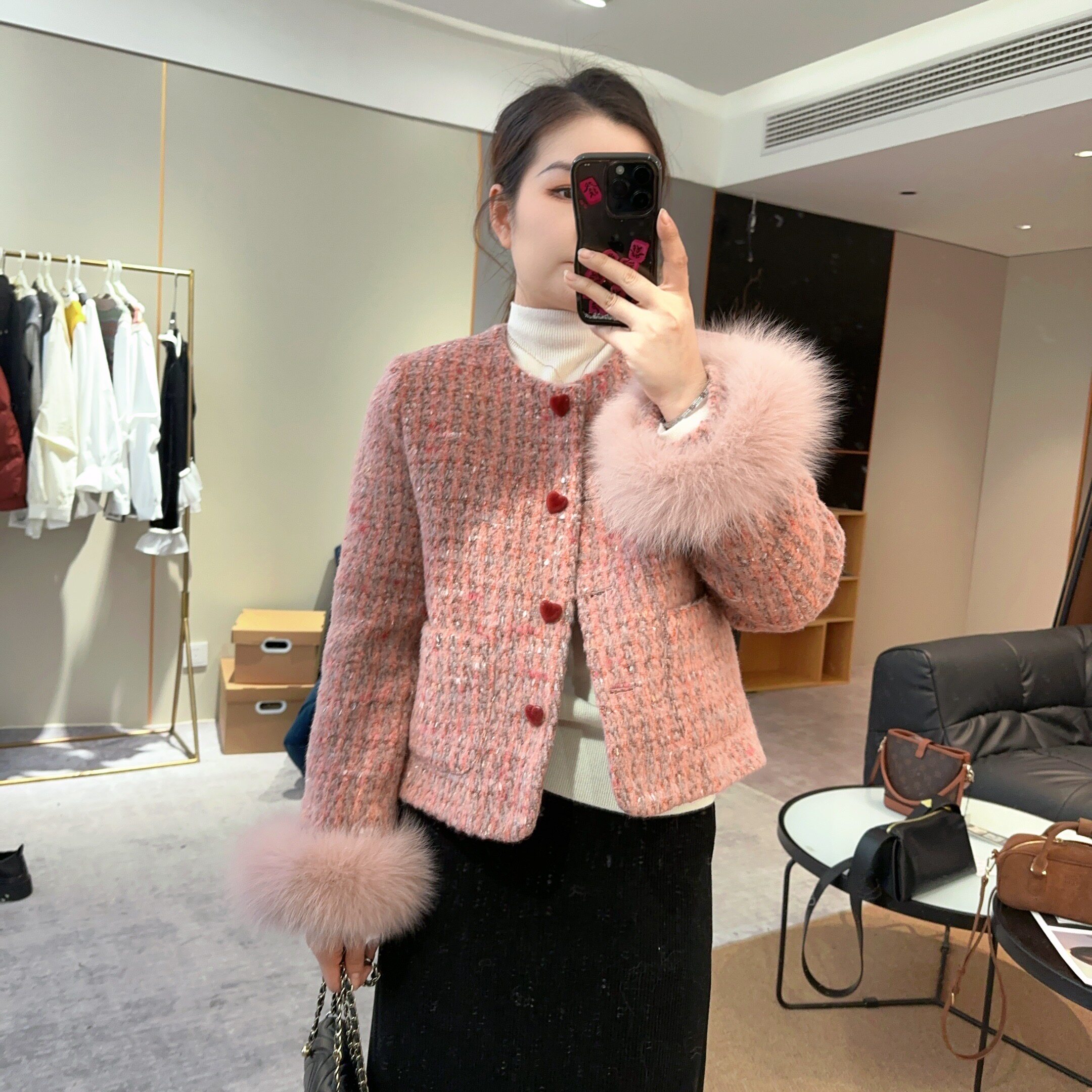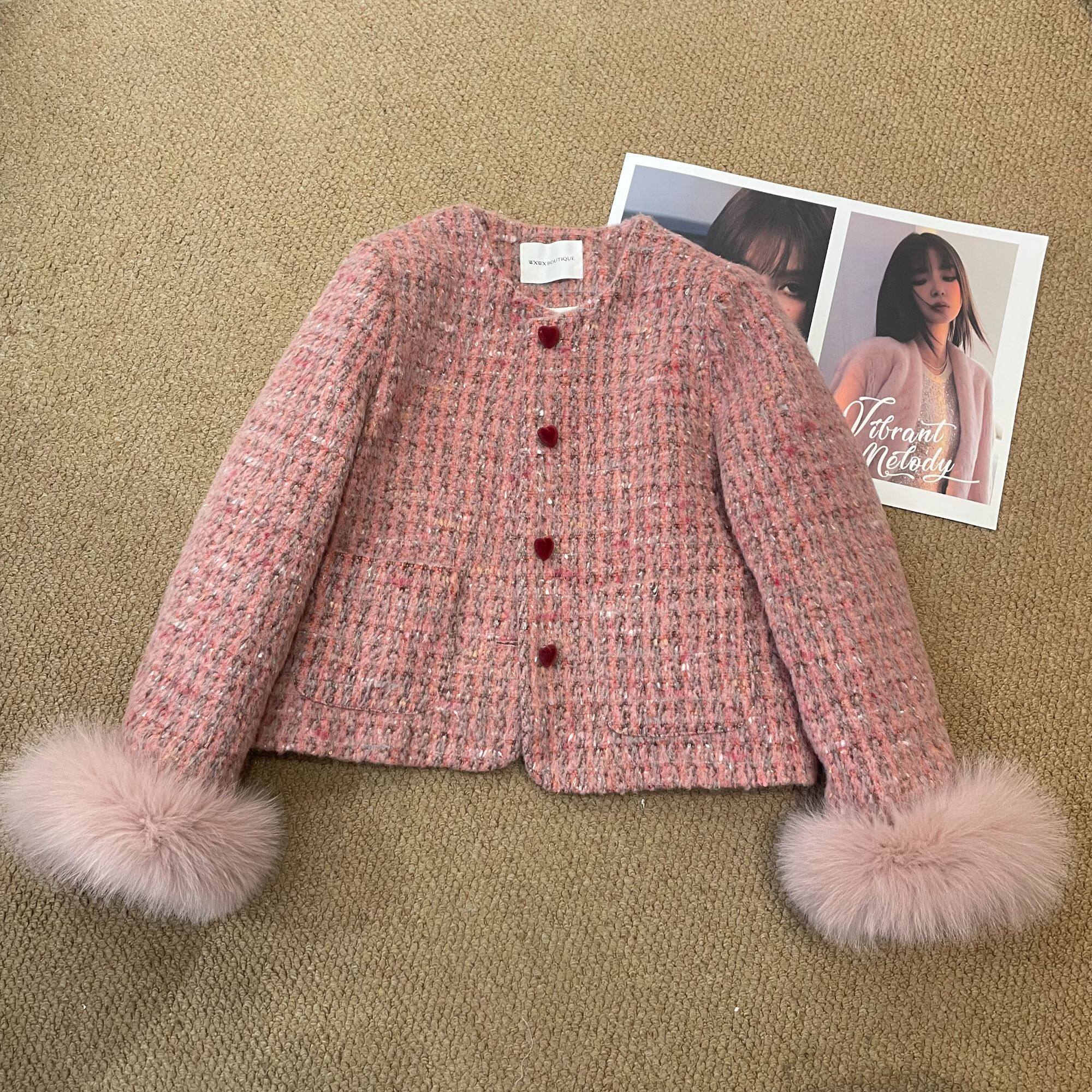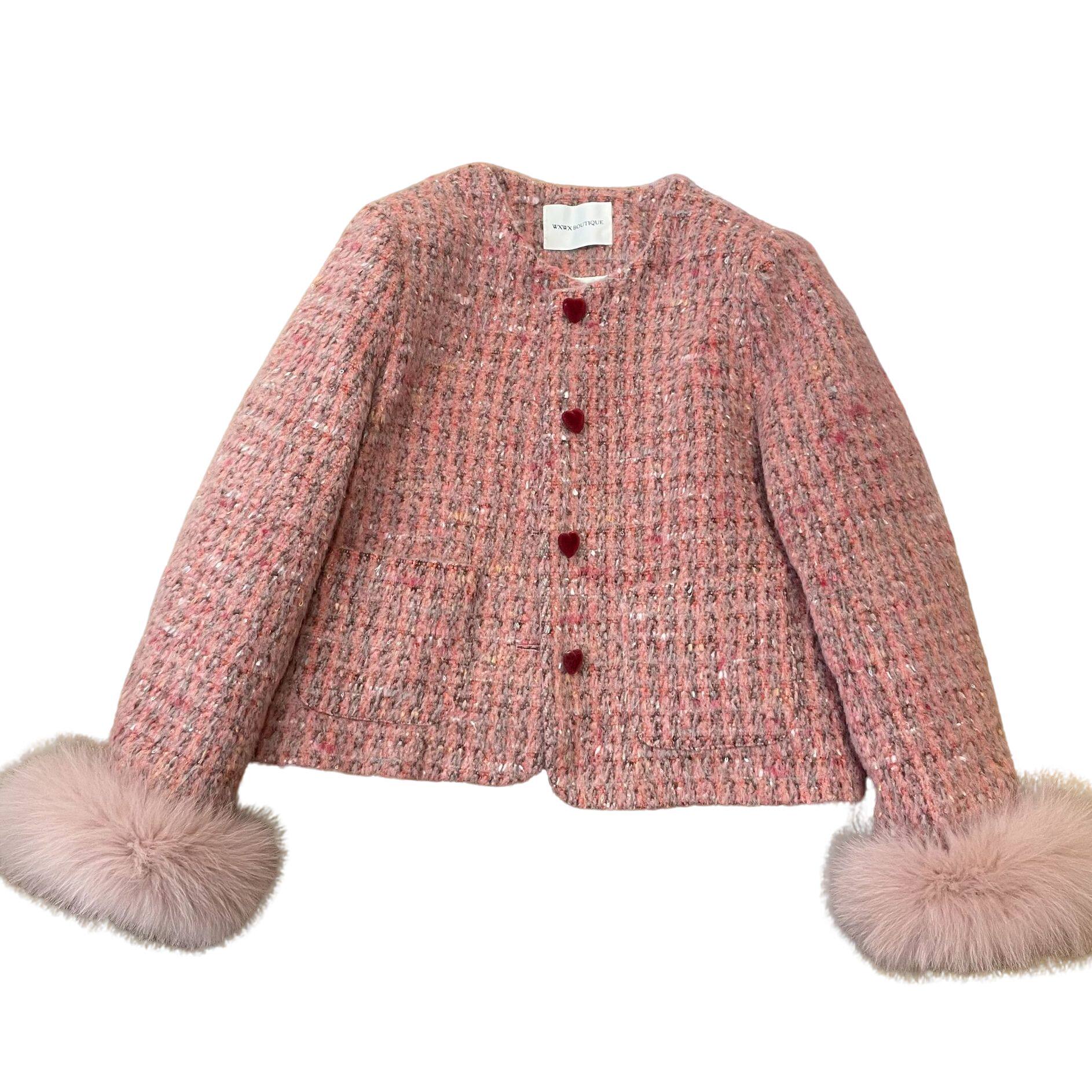 【橘粉小香】冬季时尚显瘦编织爱心扣小香风加厚外套 X5010201